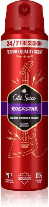 Old Spice RockStar, 200 ml, Dezodoranty i antyperspiranty dla mężczyzn, Dezodorant Old Spice RockStar skutecznie walczy z nieprzyjemnym zapachem i zapewnia długotrwałe uczucie komfortu i świeżości. Właściwości: nie pozostawia śladów na ubraniu zapewnia długotrwałą ochronę neutralizuje nieprzyjemny zapach pozostawia długotrwałe uczucie świeżości nie blokuje naturalnych procesów fizjologicznych nie podrażnia skóry przyjemnie pachnie Skład: bez soli aluminiowych Sposób użycia: Aplikuj na czystą i suchą skórę pod pachami. Aplikację możesz powtórzyć kiedykolwiek w ciągu dnia.