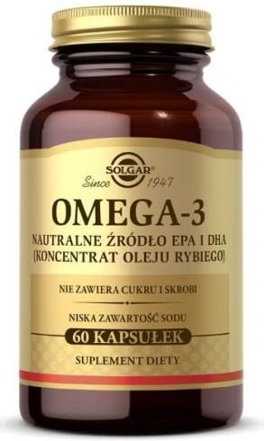 Omega-3 Naturalne źródło EPA i DHA Solgar suplement diety Produkt z polskiej dystrybucji 60 kapsułek Zalety: ✅ W jednej kapsułce dostarczamy porcję kwasów 0mega-3 równą zalecanemu dziennemu spożyciu, ✅ Produkt ten stanowi skoncentrowane źródło oleju rybiego o gwarantowanej standaryzowanej zawartości Nienasyconych Kwasów Tłuszczowych Omega 3, ✅ Uzyskany jest z sardeli i sardynek, ✅ Długa data ważności. Opis Produkt ten stanowi skoncentrowane źródło oleju rybiego o gwarantowanej standaryzowanej zawartości Nienasyconych Kwasów Tłuszczowych Omega 3 (EPA i DHA). Koncentrat oleju rybiego SOLGAR uzyskany jest z sardeli i sardynek. Dostarcza w jednej kapsułce porcję kwasów Omega 3 równą zalecanemu dziennemu spożyciu. Dla kogo jest przeznaczony: ✔️ Dla osób, które chcą zadbać o serce, ✔️ Dla osób, które chcą wspomóc prawidłowe funkcje mózgu i wzroku. Sposób użycia Osoby dorosłe 1 kapsułka dziennie, najlepiej w trakcie posiłku lub według wskazań lekarza. Nie przekraczać porcji zalecanej do spożycia w ciągu dnia. Suplement diety nie jest substytutem zróżnicowanej diety. Zrównoważona dieta oraz zdrowy tryb życia są ważne. Przechowywać w miejscu suchym, ciemnym, w sposób niedostępny dla małych dzieci. Kobiety w ciąży, matki karmiące oraz osoby zażywające leki, planujące jakiekolwiek procedury medyczne lub chirurgiczne lub osoby chore powinny przed zażyciem skonsultować się z lekarzem. Informacje dodatkowe Produkt nie zawiera: pszenicy, drożdży, produktów mlecznych, sztucznych substancji przedłużających trwałość, cukrów, skrobi, aromatów i barwników, substancji słodzących. Produkt bezglutenowy. ____________________________________________________________________________________________ Składniki Koncentrat z oleju ryb (anchois, sardynki) w tym: kwas eikozapentaenowy (EPA), kwas dokozaheksaenowy (DHA), żelatyna (wołowa), substancja glazurująca: glicerol (roślinny), przeciwutleniacz: mieszanina tokoferoli. Porcja zalecana do spożycia w ciągu dnia (1 kapsułka) zawiera: Koncentrat z oleju ryb (sardele, sardynki) – 1000 mg w tym: Kwas eikozapentaenowy (EPA)† – 160 mg Kwas dokozaheksaenowy (DHA)† – 100 mg † Wielonienasycone kwasy omega-3, w postaci naturalnych trójglicerydów. ____________________________________________________________________________________________ Informacje ogólne Zawartość opakowania: 60 kapsułek. Warunki przechowywania: Przechowywać w miejscu suchym, ciemnym, w sposób niedostępny dla małych dzieci. Producent: Solgar USA, dystrybucja w Polsce.