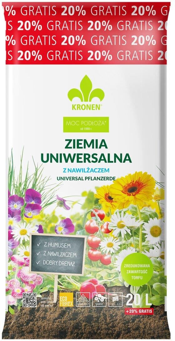 Podłoże z nawilżaczem Uniwersalna ziemia o pojemności 20 l (+ 20% gratis). Doskonała jakość produktu o drobnym drenażu, który posiada w swoim składzie nawilżacz. Ziemia jest przeznaczona do sadzenia, przesadzania wielu rodzajów roślin zielonych i kwitnących, iglaków, bylin, ziół, warzyw na balkonach, tarasach, ogrodach oraz pomieszczeniach. Nie należy jej stosować do roślin kwaśnolubnych. Pojemność: 24 l
