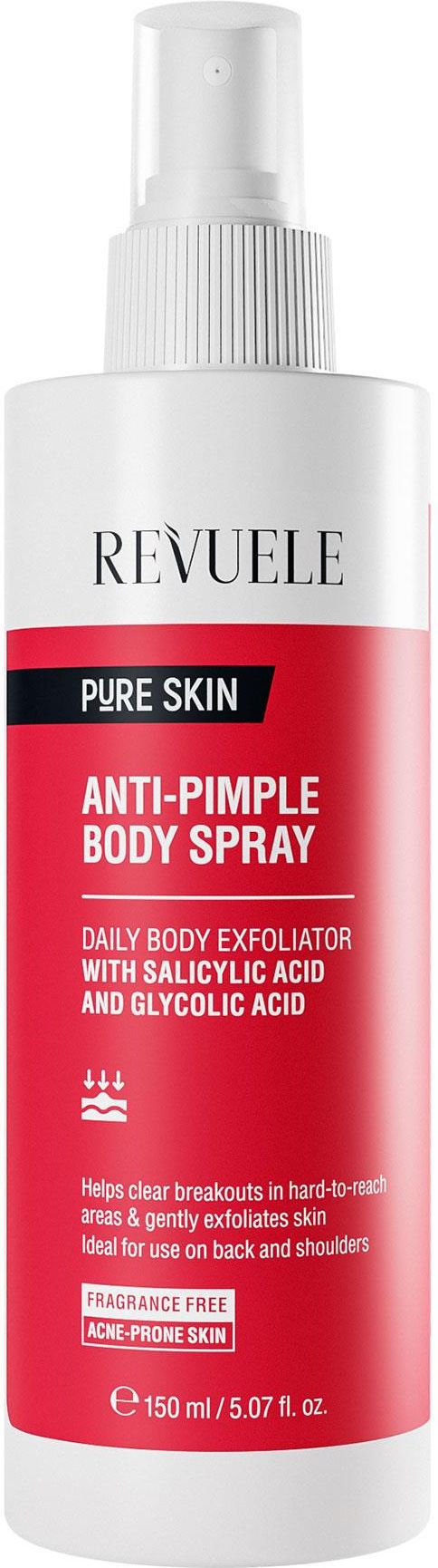 REVUELE ANTI-PIMPLE BODY SPRAY to łatwy w użyciu peeling przeznaczony do pielęgnacji skóry tłustej i mieszanej ze skłonnością do trądziku. Aktywna formuła z kwasami salicylowymi i glikolowymi działa eliminując guzy, pryszcze i zaskórniki w trudno dostępnych obszarach ciała, takich jak plecy. Spray pomaga widocznie zmniejszyć wielkość porów, zminimalizować wypryski i zapobiec ich dalszemu pojawianiu się. Sposób użycia: Rozpylić produkt z odległości 15 cm na czystą i suchą skórę, pozostawić do wyschnięcia. Tylko do stosowania na ciało, nie nakładać na twarz. Uwaga: możliwa jest indywidualna nietolerancja któregokolwiek ze składników. Unikaj kontaktu z oczami. W przypadku dostania się produktu do oczu, natychmiast przemyć je dużą ilością wody.