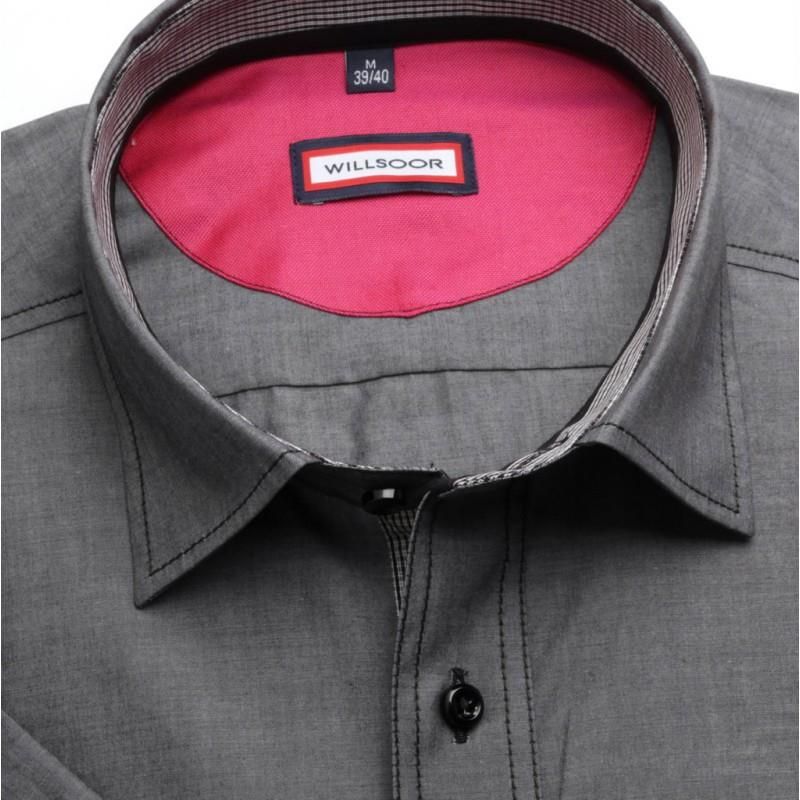 Szara taliowana koszula z krótkim klasycznym kołnierzykiem, kontrastami w kratkę i pagonem na rękawie