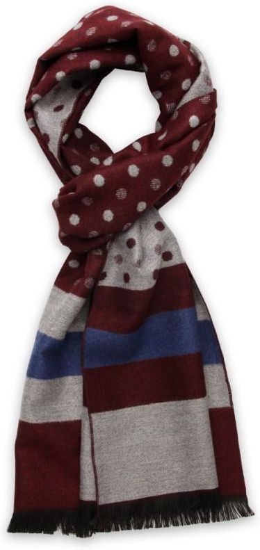 Ciepły szal z krótkimi frędzlami Ciepły szal w uniwersalnych kolorach. Urozmaici każdą kurtkę czy płaszcz. Zakończony krótkimi frędzlami. - Kolor: dwustronny - szary, bordowy i niebieski w groszki i paski - Tkanina: 100% wiskoza - Długość: 180 cm - Szerokość: 31 cm - Gwarancja: 24 m-ce