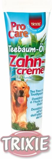 Trixie Pasta do zębów dla psa zawiera naturalny olej z australijskiego drzewa herbacianego. Regularne szczotkowanie zębów psa pomaga: * zapobiegać tworzeniu się kamienia nazębnego, * osadzaniu płytki, * zachować czystość jamy ustnej. Trixie Pasta do zębów cynamonowy smak zapewnia świeży oddech Twojego psa. Sposób użycia: * nałóż pastę na szczoteczkę do zębów psa lub na czysty wacik z gazy, * delikatnie szczotkuj lub pocieraj wokół zębów psa, * nie stosować częściej niż dwa razy dziennie. Jeśli pies nie jest przyzwyczajony do szczotkowania zębów, pozwól mu poznać to uczucie i smak pasty poprzez pocieranie jego zębów i dziąseł delikatnie niewielką ilością pasty. Dodatkowe informacje. Szczotkowanie zębów psa to bardzo skuteczna metoda zapobieganiu tworzenia się kamienia nazębnego i osadzaniu płytki. Wybredne psy należy przyzwyczaić do pasty podając mu ją na smakołyku, np: ciastku dla psa. Następnym krokiej jest zastosowanie pasty na zębach i dziąsłach psa. Należy pamiętać, aby najpierw delikatnie masować dziąsła i wargi psa przed ostatecznie rozpoczętym szczotkowaniem zębów.