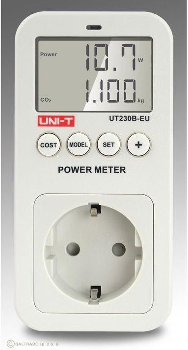 Miernik zużycia energii Uni-T UT230B-EU Gniazdo sieciowe z miernikiem zużycia energii Uni-T UT230B-EU Gniazdo sieciowe Uni-T UT230B-EU to zaawansowane narzędzie do monitorowania zużycia energii elektrycznej w Twoim domu lub biurze. Dzięki precyzyjnym pomiarom oraz funkcjom dodatkowym, takim jak obliczanie kosztów zużytej energii, to urządzenie jest idealne dla osób, które chcą świadomie zarządzać zużyciem energii i optymalizować swoje koszty. Gniazdo oferuje szerokie zakresy pomiarowe, umożliwiając dokładne monitorowanie napięcia (100-260 V), natężenia prądu (0-16 A), mocy (0-3680 W), współczynnika mocy (0-1) oraz energii (do 9999 kWh). Dzięki temu, użytkownik może w czasie rzeczywistym kontrolować parametry elektryczne urządzeń podłączonych do gniazda. Specyfikacja techniczna Napięcie znamionowe: od 100 V do 230 V AC / od 45 Hz do 65 Hz Dodatkowe zasilanie: bateryjne 3 V (CR2032) Maksymalne obciążenie: 16 A (3680 W) Minimalne zużycie: 0,4 W Energia: od 0 do 9999 kWh Dokładność zużycia energii: +/- 1% Minimalne wyświetlane zużycie energii: 0,01 kWh Czas pomiaru: Od 0 min do 9999 dni Emisja CO2: od 0 do 9999 kg Zakres pomiaru energii: od 0 kWh do 9999,99 kWh Zakres kosztów: od 0 do 9999 Zużycie energii: poniżej 0,5 W Wymiary wyświetlacza: 48 x 30,5 mm Wymiary: 130 x 65 x 37 mm Masa: 155 g