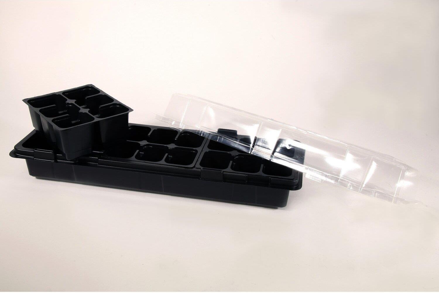 Mini szklarenka do rozsady wraz z przykryciem o wymiarach 47x16cm. Polecana do uprawy 18 sadzonek z możliwością przewietrzenia uprawianych roślin poprzez obrócenie pokrywy o 180 stopni. Wykonana jest z materiału: polistyren. W opakowaniu znajduje się 18 sztuk doniczek. Mini szklarenki idealnie nadają się do rozsady warzyw, kwiatów na np. kuchennym parapecie.