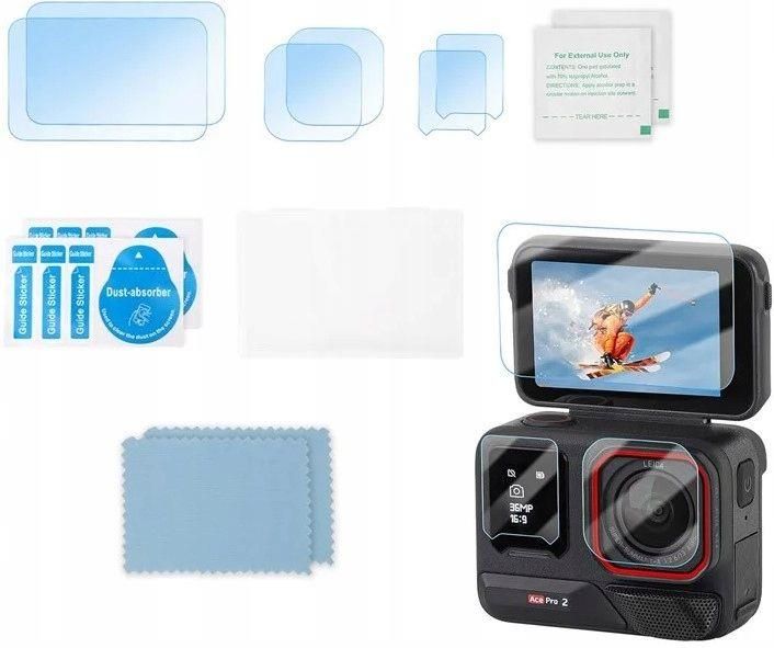 Podwójny Zestaw Osłon 3w1 Do kamery sportowej: Insta360 ACE Pro 2 W zestawie 2x osłona na obiektyw wykonana ze szkła hartowanego 9H 2x osłona na ekran główny wykonana ze szkła hartowanego 9H 2x osłona na wyświetlacz przedni wykonana z poliwęglanu + Akcesoria czyszczące GRATIS Szkła hartowane o …