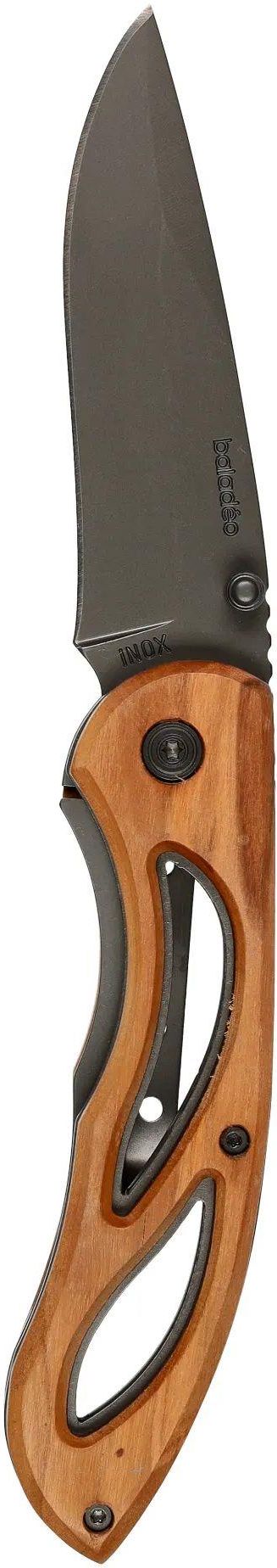 Nóż Baladeo Maringa ECO406 Składany nóż kieszonkowy Maringa. Ostrze noża wykonane ze stali nierdzewnej 420 z matowym wykończeniem, wyposażone w system blokady uniemożliwiający przypadkowe złożenie. Rączka wykonana z drewna oliwkowego, posiada klamerkę ze stali nierdzewnej pozwalający dopiąć go do spodni.Możliwość zamknięcia i otwarcia noża w jednej ręce. Parametry techniczne: 71 g / 11,5 x 3,1 x 2,0 cm.