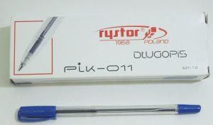 Długopis Rystor Pik-011 o średnicy kulki 0,7mm w przeźroczystej obudowie z ergonomicznym uchwytem, na wkłady wymienne (F-145). Długopis wyposażony został w wodoodporny tusz, nieblaknący spełniający normę ISO 12757-2, która określa niezbędne wymagania dla długopisów i wkładów używanych na dokumentach. Długopis posiada bardzo precyzyjną i wytrzymałą końcówkę pisząca z niklowanego srebra oraz kulkę wykonaną z węglika wolframu. Nasadka i klips w kolorze tuszu. Długość linii pisania to 1700m. Kolor tuszu czarny.