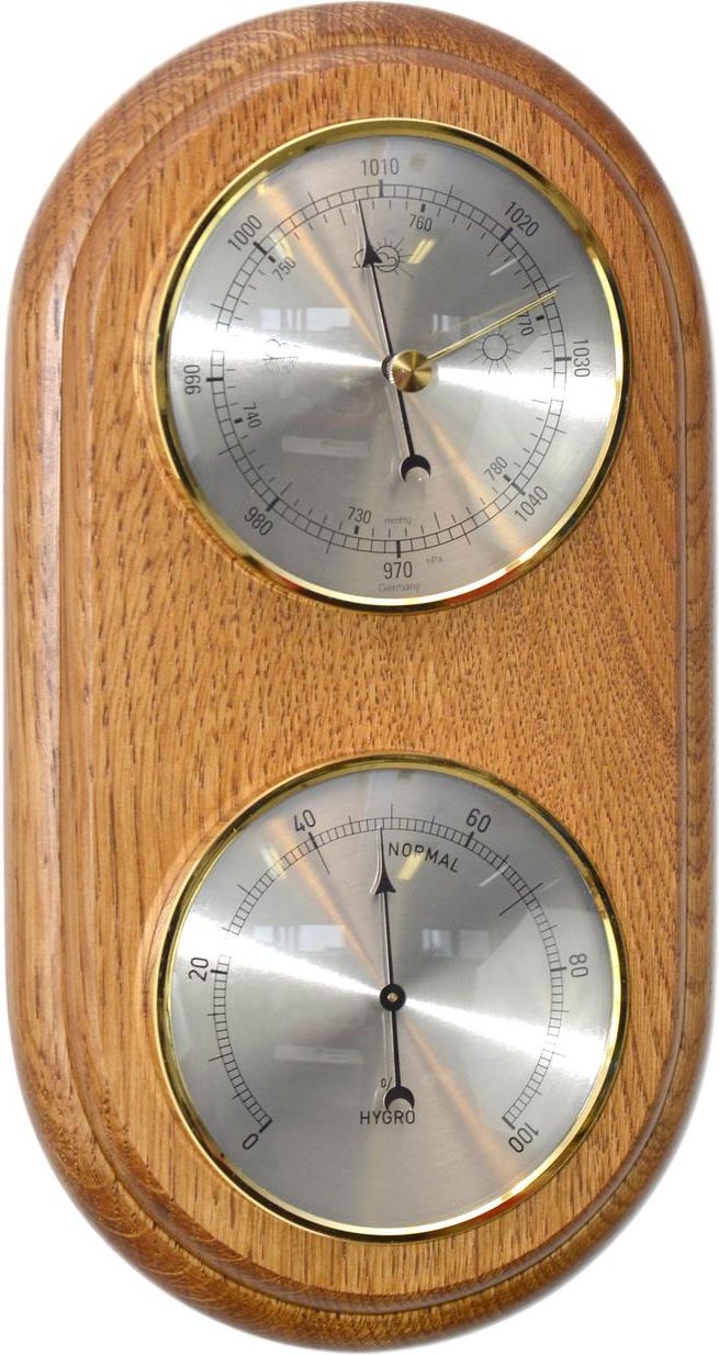 Stacja pogody OWAL BT - 01 Dąb pradawny To oryginalny upominek na każdą okazję, wyprodukowany w Polsce! Z jednej strony to praktyczny gadżet, a z drugiej oryginalny element wystroju domowego lub biurowego wnętrza, który dopasowujemy kształtem i kolorem do mebli i pozostałych aranżacji. Możemy wybrać także termometr i higrometr w tym samym stylu i dowolnie konfigurować swoją własną stację pogody. Prezentowana stacja pogody jest wykonana na pięknej drewnianej podstawie, gdzie umieszczone są złote tarcze otoczone złotym pierścieniem. Tarcze wskazują: ciśnienie atmosferyczne w hPa i mmHg i temperaturę. W barometrze złota wskazówka na szybce służy do porównywania wysokości ciśnienia z np. dniem poprzednim (należy ustawić ją pokrywając z czarną wskazówką ciśnienia na tarczy, a następnego dnia sprawdzić odchyłkę, czy ciśnienie wzrosło czy zmalało. Barometr: Pomiar ciśnienia atmosferycznego w hPa i mmHg Termometr: Pomiar temperatury otoczenia - wskazuje temperaturę powietrza w stopniach C. Rodzaj obudowy: Drewniana - drewno dębowe Tarcza: Złota Kolor obudowy: Dąb pradawny Wymiary: 26 x 14 x 5 cm Barometr, termometr: Średnica 9 cm Na dolnej tarczy widoczne wnętrze z mechanizmem Gwarancja: 2 lata. Zapraszamy do naszego sklepu