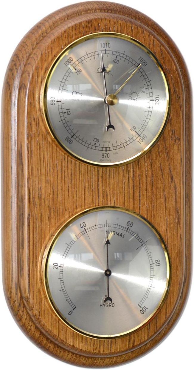 Barometr Higrometr TFA OWAL2D-N-BH-08-BWA W komplecie: Oryginalny produkt w pudełku Parametry: Barometr: Pomiar ciśnienia atmosferycznego Higrometr: Pomiar wilgotności powietrza Rodzaj obudowy: Drewniana Kolor obudowy: Jasny orzech Wymiary : Wysokość 26 cm, szerokość 14 cm, grubość 4 cm, Średnica tarczy: 9 cm