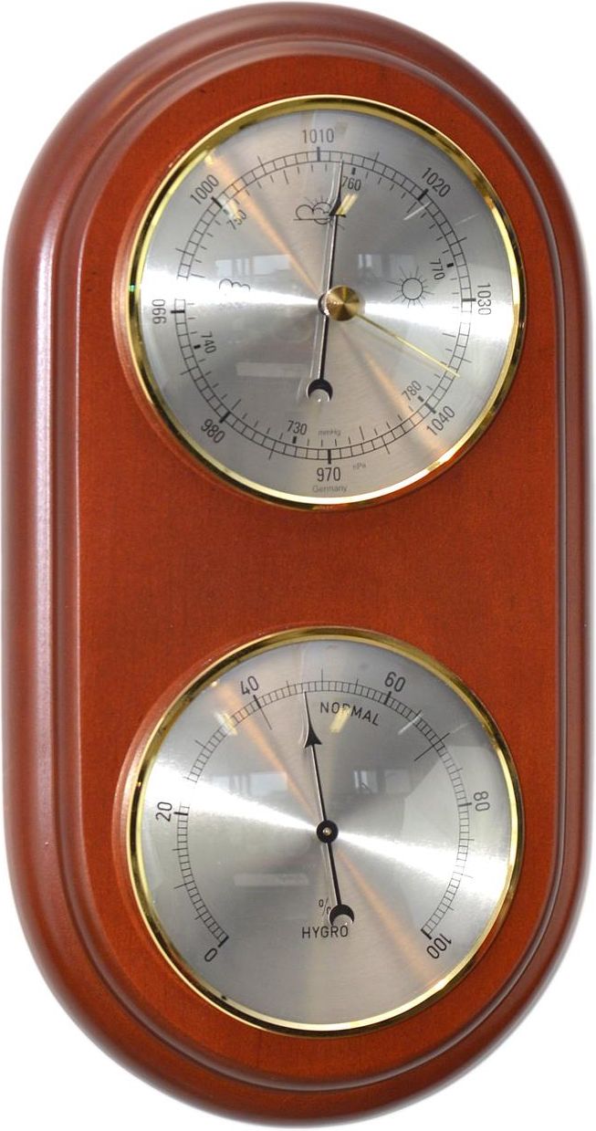 Barometr Higrometr TFA OWAL2D-N-BH-07-CH W komplecie: Oryginalny produkt w pudełku Parametry: Barometr: Pomiar ciśnienia atmosferycznego Higrometr: Pomiar wilgotności powietrza Rodzaj obudowy: Drewniana Kolor obudowy: Wiśnia Wymiary : Wysokość 26 cm, szerokość 14 cm, grubość 4 cm, Średnica dużej tarczy: 8.5 cm