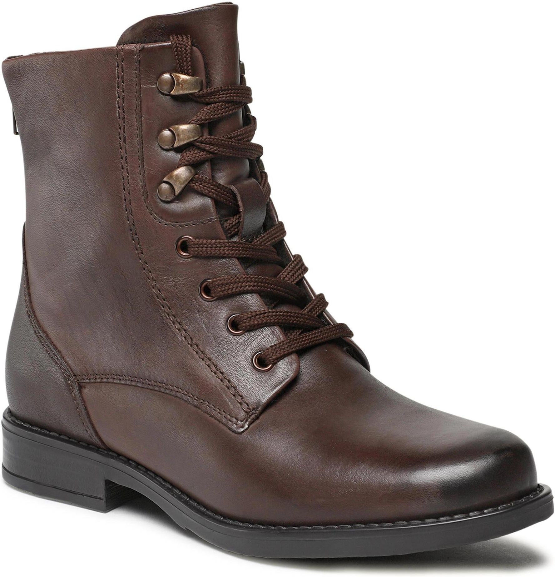 Damskie trzewiki Lasocki wykonane są z licowej skóry naturalnej. Wyższa cholewka w kolorze brązu z ozdobnym zamkiem nad piętą. Trzewiki mają sznurowanie z dodatkowymi napami na górze cholewki oraz zamek, który ułatwia codzienne zakładanie i ściąganie obuwia. Buty mają płaską podeszwę oraz obcas wysokości 3 cm. Trzewiki są przeznaczone na sezon jesienny i zimowy. Bardzo dobrze łączą się ze stylizacjami casualowymi w połączeniu ze spodniami i sukienkami. Warto także pamiętać o nawilżaniu skóry naturalnej w tym celu warto użyć kremu do pielęgnacji licowych skór naturalnych. Produkt posiada certyfikat Leather Working Group (LWG). Leather Working Group to międzynarodowa organizacja, która stworzyła standard zarządzania środowiskiem w przemyśle skórzanym. Certyfikaty Leather Working Group (LWG) są przyznawane jedynie tym producentom skór, którzy dochowują najwyższej staranności w zakresie ochrony środowiska i wydajności w całym procesie produkcji.