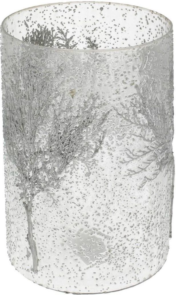 Świecznik szklany zdobiony srebrnymi gałązkami. Świecznik świąteczny ze szkła w otoczeniu gałązek brokatowych to efektowna ozdoba, która wnosi do wnętrza wyjątkowy urok i magiczną atmosferę świąt. Jego delikatne półprzezroczyste szkło nadaje mu subtelności, a zarazem sprawia, że światło świecy, rozprasza się w sposób niezwykle uroczy i łagodny. Ozdobą świecznika są gałązki brokatowe w srebrnym kolorze. Te migoczące elementy dodają mu blasku i elegancji, a ich delikatny błysk przypomina nam o magicznej aurze świąt Bożego Narodzenia. Kiedy zapalasz świecę w świeczniku Twig, całe wnętrze wypełnia się ciepłem i blaskiem. Sprawdź nasze inne propozycje na świąteczne świeczniki!Wymiary: śr. 15 cm, wys. 25 cm.