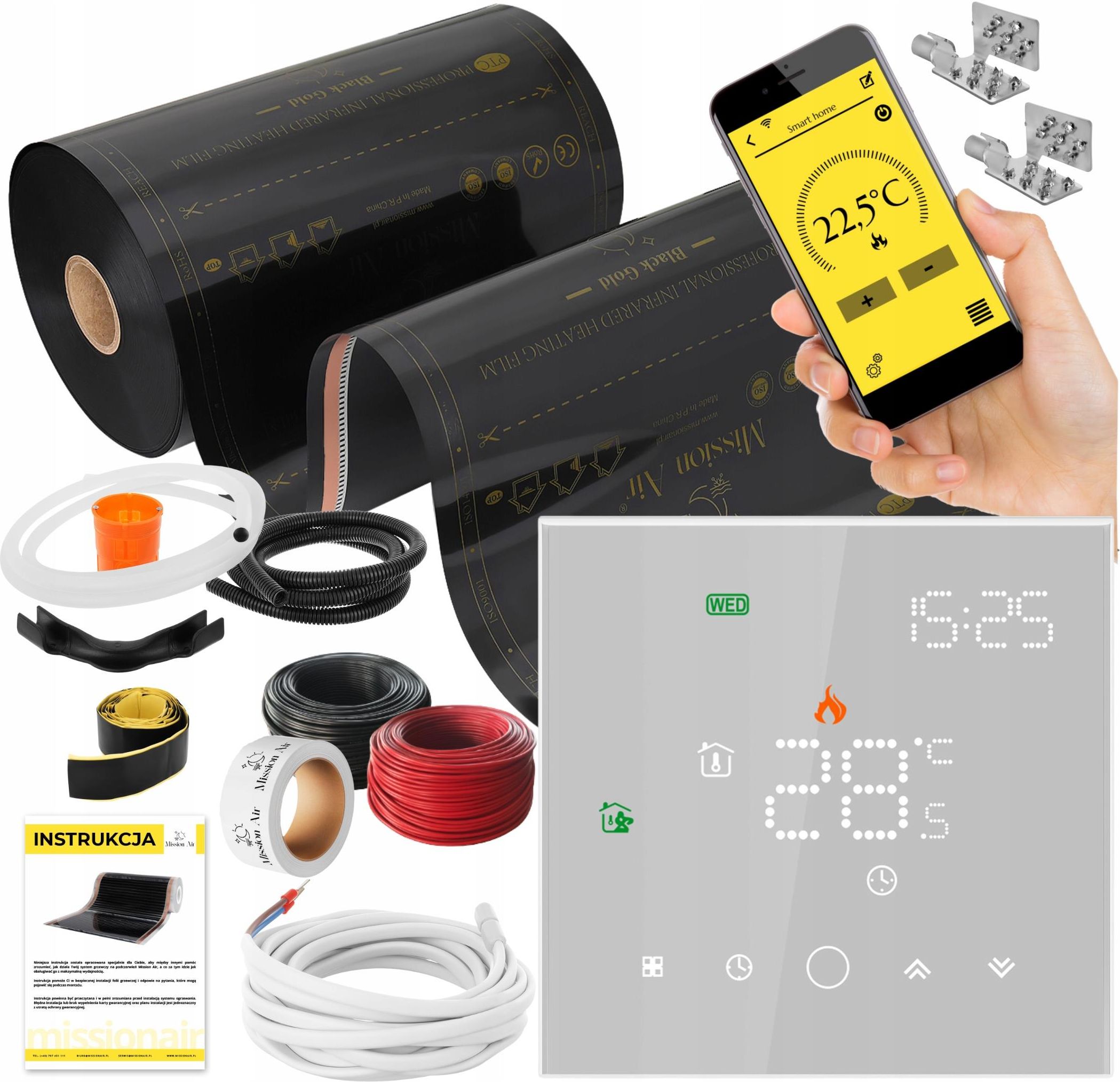 Mission Air® Black Gold PTC 160W/m² Zestaw ogrzewania na podczerwień, który możemy zastosować jako Ogrzewanie podłogowe Ogrzewanie ścienne Ogrzewanie sufitowe Ogrzewanie pod lustro ( antypara ) Skład zestawu Folia grzewcza na podczerwień BLACK GOLD PTC: Moc folii: 160 W/m² Szerokość: 100 cm Powierzchnia grzewcza: 8 m² Sterownik programowalny z obsługą WiFi oraz odbiornikiem radiowym MissionAir® Gemini Black Taśma samoprzylepna montażowa - 1 szt. Zestaw przyłączeniowy: Konektory przyłączeniowe - 6szt Taśma samowulkanizująca - 54cm Zestaw instalacyjny Puszka elektryczna podtynkowa -1szt Peszel ochronny przewodów -1szt Przewody zasilające 2,5 mm² w dwóch kolorach: Kolor X: 10 mb Kolor Y: 10 mb Działanie folii grzewczej na podczerwień marki MissionAir Nowoczesna folia grzewcza na podczerwień to rodzaj niezwykle cienkiego promiennika podczerwieni, który przeznaczony jest do wykorzystania w ogrzewaniu podłogowym, ściennym oraz sufitowym. Może posłużyć również jako ogrzewanie luster, tzw. antypara. Folia grzewcza skutecznie wytwarza opór elektryczny na pasmach grafitu, który oddawany jest w postaci promieniowania podczerwonego o długiej fali. Dzięki temu ogrzewanie takie jest w pełni bezpieczne dla zdrowia i nie przenika do głębszych tkanek skóry. Ciepło emitowane przez folię odczuwalne jest przez organizmy żywe i ogrzewa również przedmioty bez strat energii na ogrzewanie powietrza. Zastosowanie folii na podczerwień w ogrzewaniu podłogowym, pozwala osiągnąć tak bardzo przez nas lubiany efekt ciepłej podłogi. Nowoczesna technologia PTC Folie grzewcze na podczerwień Mission Air® z serii Black Gold posiadają technologię PTC, która jest unikalna w swojej klasie! PTC funkcjonuje na zasadzie wzrostu rezystancji obwodu wraz ze wzrostem temperatury. W następstwie skutkuje to zjawiskiem obniżenia prądu przepływającego przez element grzewczy. Możemy zatem śmiało stwierdzić, że moc obwodu maleje wraz ze wzrostem temperatury. Dzięki swojej samoregulacji elementy grzejne PTC nie mogą się przegrzewać, co sprawia, że jest to szczególnie bezpieczna i niezawodna technologia grzewcza. Zdecydowaną zaletą płynącą z zastosowania technologii PTC jest zauważalnie mniejsze zużycie energii elektrycznej w porównaniu z tradycyjnym systemem grzewczym. Szeroki wybór folii grzewczych W naszej ofercie znajdują się folię o różnych mocach: 140 W/m² 160 W/m² Black Silver 160 W/m² Black Gold PTC 220 W/m² Dostępne są również różne szerokości 30 cm (Black Silver) 50 cm 100 cm Możliwość cięcia co 25 cm w wyznaczonym miejscu na tylnej stronie. Dobierz system idealnie dopasowany do swoich potrzeb! Nowoczesny regulator temperatury Mission Air® GEMINI Black Nowoczesny design Obsługa WiFi Współpraca z asystentem głosowym Google Home oraz Amazon Alexa Dwie niezależne jednostki- komunikacja radiowa Wybór systemu ogrzewania podłogowego powiązany jest również z odpowiednim doborem regulatora temperatury. Programowalny radiowy regulator temperatury GEMINI to zestaw składający się z regulatora temperatury oraz odbiornika, które łączą się ze sobą za pomocą połączenia radiowego. Jednostką sterującą możemy zarządzać zdalnie za pomocą domowej sieci WiFi na smartfonie lub tablecie z system Android lub iOS. Niewątpliwą zaletą jest fakt, że jednostka sterująca nie wymaga podłączenia do sieci, zasilana jest bateryjnie. Dzięki temu możemy ją ulokować w dowolnym miejscu w pomieszczeniu. Regulator wyposażony jest w czujnik temperatury pokojowej, wbudowany w jednostkę sterującą. Sterowanie Wi-Fi oraz komendy głosowe Regulatorem MissionAir GEMINI możemy sterować na dwa sposoby: Sterowanie manualne za pomocą dotykowego panelu, Sterowanie zdalne z wykorzystaniem domowej sieci Wi-Fi, poprzez darmową aplikację mobilną SmartLife zainstalowaną na smartfonie lub tablecie. Z poziomu aplikacji możemy sterować większością ustawień i parametrów sterownika. Dodatkowo Regulator GEMINI umożliwia sterowanie głosowe za pomocą asystentów Amazon Echo oraz Google Home Zarządzanie temperaturą w domu jeszcze nigdy nie było tak wygodne! Dowolność montażu Dzięki niezależnemu zasilaniu (2xAA lub USB) oraz łączności radiowej, sterownik może zostać umiejscowiony w dowolnym miejscu w pomieszczeniu. 2 sposoby montażu do wyboru wiszący naścienny stojący W skład zestawu wchodzi specjalnie zaprojektowana podpórka montowana na tylnym panelu sterownika. Dzięki niej sterownik możemy postawić na półce lub szafce. Sterownik możemy również oczywiście powiesić na ścianie dzięki specjalnym otworom montażowym w tylnej części obudowy. Nowoczesny, minimalistyczny design sterownika Mission Air GEMINI sprawia, że może on stać się ozdobą każdego pomieszczenia. Odbiornik radiowy Dedykowany do połączenia sterownika z elektrycznym systemem grzewczym. Odbiornik przystosowany jest do montażu z wykorzystaniem standardowej puszki podtynkowej Ø 60 mm (dołączona do zestawu). Zestaw GEMINI przystosowany jest do sterowania zestawami ogrzewania wykorzystującymi elektryczne maty grzewcze pod płytki lub panele podłogowe maty grzewcze na podczerwień IR Samodzielny system grzewczy System ogrzewania z wykorzystaniem folii grzewczych na podczerwień to obecnie najbardziej wydajny i najbardziej energooszczędny system grzewczy dostępny na rynku. Folie grzewcze charakteryzują się niezwykle szybkim czasem reakcji termicznej, szczególnie w porównaniu z tradycyjnym podłogowym ogrzewaniem wodnym. Ciepło emitowane przez system odczuwalne jest niemal natychmiastowo po rozpoczęciu pracy. Prawidłowo zaprojektowany system z wykorzystaniem folii grzewczych z serii Black Gold, z powodzeniem może pełnić rolę jedynego i samodzielnego ogrzewania w pomieszczeniu. Oszczędzaj z Mission Air®! Ciągle rosnące koszty tradycyjnego ogrzewania gazowego oraz szybujące w górę ceny węgla zdecydowanie prz