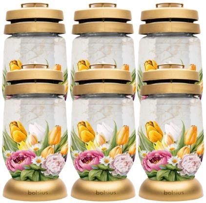 Znicze BOLSIUS 3S 19 Wiosna (100794926882) Informacje: Ilość: 6 szt. Rozmiar: 22,5x11cm (wysokość z deklem x średnica podstawy) Szerokość otworu: 6cm Czas palenia: 36h (znicz zawiera wkład parafinowy marki Bolsius) Kolor podstawy i dekla: złoty Ozdobny lampion przedstawiający kolorowy, kwiatowy …