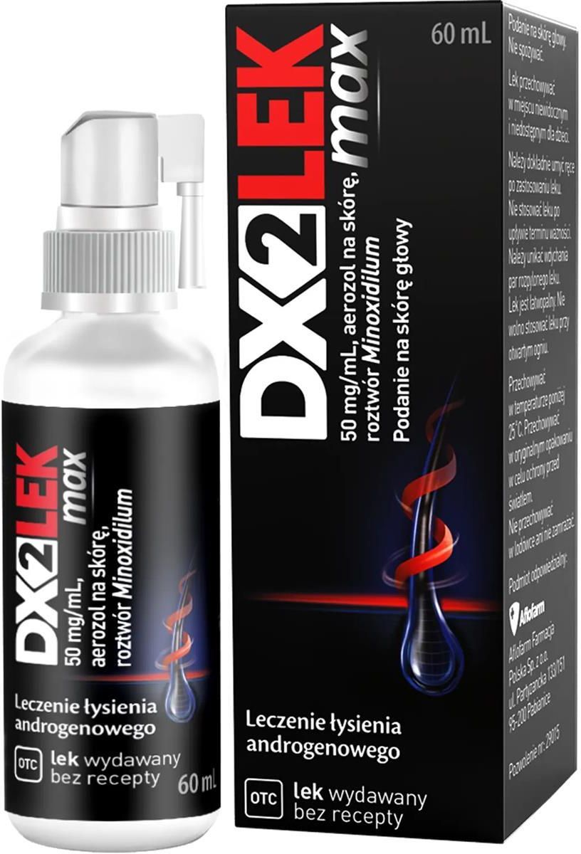DX2Lek Max to produkt leczniczy w postaci roztworu do stosowania miejscowego na skórę głowy. Zawiera minoksydyl, substancję czynną o potwierdzonym działaniu w pobudzaniu wzrostu włosów. Preparat jest przeznaczony dla kobiet i mężczyzn w wieku 18–65 lat zmagających się z łysieniem androgenowym. Wskazania do stosowania: Leczenie łysienia androgenowego (wypadania włosów) u kobiet i mężczyzn w wieku od 18 do 65 lat. Skład: 1 ml roztworu zawiera: substancja czynna: minoksydyl 50 mg, pozostałe składniki: glikol propylenowy, etanol 96%, kwas cytrynowy jednowodny, woda, oczyszczona. Działanie: Pobudza mieszki włosowe do ponownej aktywności, wspierając odrastanie włosów. Hamuje nadmierne wypadanie włosów – pierwsze efekty w postaci zmniejszenia utraty włosów mogą być zauważalne już po około 2 miesiącach stosowania. Stymuluje porost nowych włosów – widoczne odrastanie może pojawić się po 2 miesiącach regularnego używania. Maksymalne efekty terapeutyczne obserwuje się po około 12 miesiącach systematycznej aplikacji. Preparat działa w miejscu aplikacji – na obszarach dotkniętych przerzedzeniem włosów. Skuteczność terapii zależy od regularności stosowania oraz wczesnego rozpoczęcia leczenia. Dawkowanie: Ten lek należy stosować zawsze dokładnie tak, jak to opisano w tej ulotce dla pacjenta lub według zaleceń lekarza lub farmaceuty. W razie wątpliwości należy zwrócić się do lekarza lub farmaceuty. Lek jest przeznaczony do stosowania wyłącznie na skórę głowy. O ile lekarz nie zaleci inaczej, lek zwykle stosuje się jak opisano poniżej. Dorośli (w wieku od 18 do 65 lat): 1 mL roztworu należy nanosić na skórę głowy w miejscach łysienia i wmasować w skórę (najczęściej szczyt głowy i zakola czołowe), dwa razy na dobę, rano i wieczorem. Objętość 1 rozpylenia (naciśnięcia pompki z aplikatorem) wynosi 0,2 mL. 1 mL roztworu uzyskuje się po pięciokrotnym naciśnięciu pompki z aplikatorem. Nie należy stosować więcej niż 2 mL roztworu na dobę. Przed zastosowaniem leku włosy i skóra głowy powinny być całkowicie suche. Instrukcja stosowania: Chronić oczy, nos i usta. Przed pierwszym użyciem należy przygotować pompkę z aplikatorem. W tym celu, trzymając pojemnik w pozycji pionowej, należy nacisnąć pompkę z aplikatorem 4 razy. Lek wymaga zamontowania końcówki dozownika przed pierwszym użyciem. Aby nałożyć lek na skórę głowy w miejscach łysienia, przed użyciem przekręcić aplikator w bok, a następnie nacisnąć. Skierować aplikator w kierunku powierzchni skóry objętej zmianami. Nacisnąć aplikator 5 razy w celu podania dawki 1 mL. Rozprowadzić roztwór opuszkami palców, upewniając się, że lek został nałożony równomiernie. Po nałożeniu leku na skórę głowy należy dokładnie umyć ręce. Czas trwania leczenia: Konieczne może być stosowanie leku dwa razy na dobę przez 4 miesiące lub dłużej. Porost włosów rozpoczyna się przeważnie po 2 miesiącach leczenia lekiem DX2LEK max. Jeżeli po 2 miesiącach nastąpi porost włosów, konieczne jest dalsze stosowanie leku DX2LEK max dwa razy na dobę, aby podtrzymać jego działanie. Po przerwaniu leczenia minoksydylem w postaci aerozolu na skórę, czasami obserwowano zatrzymanie wzrostu włosów, a niekiedy powrót do poprzedniego wyglądu w ciągu 3 do 4 miesięcy. Leczenie należy przerwać, jeśli poprawa nie nastąpi po 12 miesiącach stosowania leku. Działania niepożądane: Jak każdy lek, lek ten może powodować działania niepożądane, chociaż nie u każdego one wystąpią. Należy natychmiast skontaktować się z lekarzem, jeśli wystąpi którykolwiek z poniższych objawów, ponieważ może być konieczna pilna pomoc medyczna: obrzęk twarzy, warg lub gardła, który utrudnia połykanie lub oddychanie. Mogą to być objawy ciężkiej reakcji alergicznej (częstość nieznana, nie może być określona na podstawie dostępnych danych). Często występują: ból głowy, ból w klatce piersiowej, świąd, miejscowy rumień, nadmierny wzrost włosów, wysypka, zapalenie skóry, obrzęk. Rzadko występują: niedociśnienie tętnicze, suchość skóry, łuszczenie skóry, przejściowa utrata włosów. Interakcje: Należy powiedzieć lekarzowi lub farmaceucie o wszystkich lekach stosowanych przez pacjenta obecnie lub ostatnio, a także o lekach, które pacjent planuje stosować. Leku DX2LEK max nie należy stosować jednocześnie z innymi lekami do stosowania miejscowego na skórę głowy, takimi, jak: kortykosteroidy, tretynoina, ditranol czy wazelina, ponieważ mogą one zwiększać przenikanie minoksydylu przez skórę do krwi i nasilać ryzyko działań niepożądanych. Przeciwwskazania: Kiedy nie stosować leku DX2LEK Max: jeśli pacjent ma uczulenie na minoksydyl lub którykolwiek z pozostałych składników tego leku, w okresie ciąży i karmienia piersią, jeśli pacjent ma nadciśnienie tętnicze (leczone i nieleczone), w przypadkach nagłej lub niewyjaśnionej utraty włosów, jeżeli utrata włosów związana jest z ciężkimi chorobami, takimi jak zaburzenie czynności tarczycy, toczeń układowy, utrata włosów z pewnej powierzchni skóry z powodu stanu zapalnego skóry głowy lub innych chorób, jeśli pacjent ma ogoloną lub zmienioną chorobowo skórę głowy (np. ma łuszczycę, stan zapalny, skóra głowy jest zaczerwieniona, podrażniona lub bolesna), jeśli pacjent stosuje opatrunki okluzyjne (uszczelniające) lub stosuje miejscowo inne leki, u dzieci i młodzieży w wieku poniżej 18 lat i u osób w podeszłym wieku. Ostrzeżenia i środki ostrożności: Przed rozpoczęciem stosowania leku DX2LEK max należy omówić to z lekarzem lub farmaceutą. Lek DX2LEK max przeznaczony jest wyłącznie do stosowania miejscowego na zdrową skórę głowy. Nie należy stosować leku DX2LEK max na inne części ciała niż miejsca łysienia na skórze głowy. W razie przypadkowego kontaktu leku z innymi 