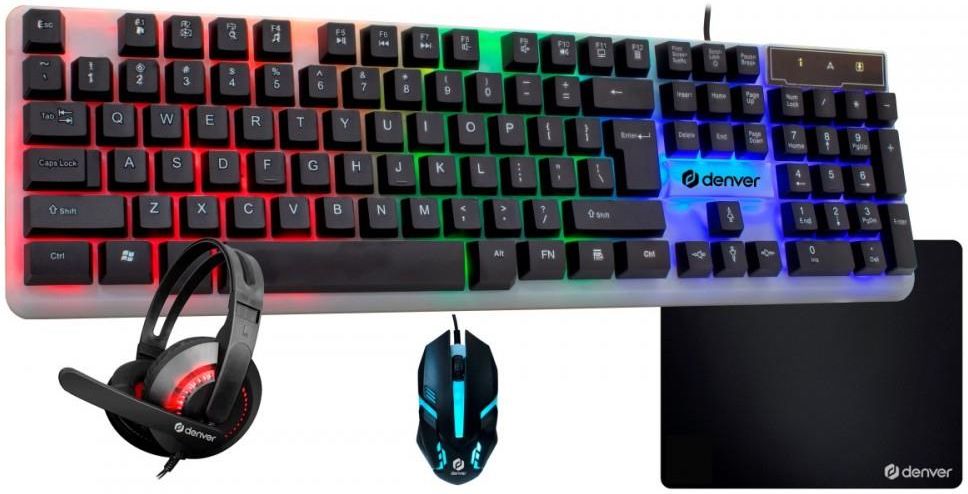 DENVER GCO-6104 w 1 Gaming Comboz przewodową klawiaturą, myszą, zestawem słuchawkowym + podkładką pod myszPakiet Combo dla gracza Przewodowa klawiatura z tęczowym podświetleniem i kablem USB o długości 1,5 m Przewodowa mysz z funkcją podświetlenia Przewodowy zestaw słuchawkowy z funkcją światła RGB, kablem 1,7M z wtyczką USB i 3,5mm oraz wbudowanym mikrofonem Podkładka pod mysz o wymiarach: 180x200 Wszystko, czego potrzebujesz, aby dopasować się do swojej ulubionej gry