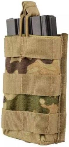 Uszyta z wytrzymałego nylonu uniwersalna, pojedyncza ładownica otwarta typu shingle. Mieści jeden magazynek typu M4/M16 (STANAG) / AK / G36. Magazynek jest od góry zabezpieczony przed wypadnięciem elastyczną linką shock-cord. Jest kompatybilna z systemem montażowym MOLLE, co pozwala na jej zamocowanie na wszelkiego typu kamizelkach, pasach i plecakach. Dane techniczne: Wykonanie: Nylon Pojemność: 1 magazynek Waga: 70 g Kolor: Multicam Mocowanie: MOLLE