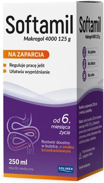 Softamil, roztwór doustny na bazie Makrogolu 4000, od 6 miesiąca, smak brzoskwiniowy, 250 ml Softamil to wyrób medyczny w postaci roztworu doustnego na bazie Makrogolu 4000 o przyjemnym brzoskwiniowym smaku. Jedna butelka (250 ml) zawiera 125 g makrogolu 4000. Produkt nie zawiera cukru, laktozy ani glutenu. Kiedy stosuje się Softamil? Softamil jest wskazany w leczeniu: przewlekłych zaparć, kamieni kałowych (uporczywe zaparcia z zaleganiem stolca w odbytnicy i/lub okrężnicy, potwierdzone badaniem lekarskim), zaparć przebiegających z epizodyczną lub przewlekłą kolką. Zastosowanie Softamil stosuje się u osób dorosłych oraz dzieci od 6. miesiąca życia w leczeniu: przewlekłych zaparć, kamieni kałowych (uporczywego zaparcia z gromadzeniem się stolca w odbytnicy i/lub okrężnicy, potwierdzonego badaniem fizykalnym jamy brzusznej i odbytnicy), zaparć przebiegających z epizodyczną lub przewlekłą kolką. Sposób użycia Jak stosować roztwór doustny z Makrogolem 4000 Softamil? Dorośli i dzieci powyżej 8 lat: 20-40 ml roztworu dziennie, najlepiej jednorazowo rano. Popić wodą lub innym płynem np. sokiem lub herbatą (150 ml) lub rozpuścić w szklance (150 ml) płynu. Dzieci w wieku od 4 do 7 lat: 15-30 ml roztworu dziennie, najlepiej jednorazowo rano. Popić wodą lub innym płynem np. sokiem lub herbatą (150 ml) lub rozpuścić w szklance (150 ml) płynu. Dzieci w wieku od 2 do 3 lat: 10-15 ml roztworu dziennie, najlepiej jednorazowo rano. Popić wodą lub innym płynem np. sokiem lub herbatą (150 ml) lub rozpuścić w szklance (150 ml) płynu. Niemowlęta w wieku od 6 miesięcy do 1 roku (o masie ciała> 7 kg): 5-10 ml roztworu dziennie, najlepiej jednorazowo rano. Popić wodą (150 ml) lub rozpuścić w szklance wody (150 ml). Po użyciu miarkę należy przepłukać ciepłą wodą z kranu i nie wkładać jej z powrotem do pudełka, dopóki nie wyschnie. U dzieci w wieku poniżej 12 lat zaleca się stosowanie pod nadzorem lekarza. Nie stosować roztworu doustnego Softamil dłużej niż 30 kolejnych dni. Jeśli objawy nie ustąpią, należy zasięgnąć porady lekarza. Składniki 250 ml produktu zawiera: makrogol 4000 125 g; substancje pomocnicze: woda oczyszczona, kwas cytrynowy, aromat, benzoesan sodu, sorbinian potasu, sukraloza. Przeciwwskazania Roztworu doustnego Softamil nie należy stosować w przypadku: stwierdzonej nadwrażliwości na którykolwiek ze składników preparatu, perforacji i/lub niedrożności przewodu pokarmowego, znanych zmian w żołądku lub jelitach, ciężkich stanów zapalnych przewodu pokarmowego, takich jak choroba Leśniowskiego-Crohna, wrzodziejące zapalenie jelita grubego i toksyczne rozszerzenie okrężnicy.