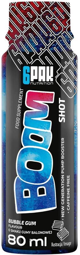6PAK Boom Shot to przedtreningowy shot bez kofeiny, idealny dla osób trenujących wieczorem lub wrażliwych na stymulanty. Zawiera aż trzy formy prekursorów tlenku azotu – jabłczan cytruliny, AAKG i l-argininę.