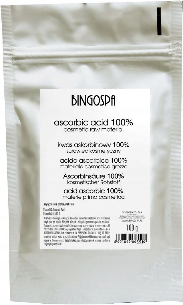 BINGOSPA Kwas askorbinowy złuszczanie 100 g Kwas askorbinowy 100 % (surowiec kosmetyczny) Dla profesjonalistów. Kwas askorbinowy charakteryzuje się silnymi właściwościami antyoksydacyjnymi. Neutralizując wolne rodniki, zabezpiecza skórę przed przedwczesnym starzeniem. Przyspiesza także proces naturalnego złuszczania wierzchnich warstw naskórka, dzięki czemu rozjaśnia skórę oraz zmniejsza skłonność do przebarwień i piegów, działa wybielająco. Kwas askorbinowy wpływa na zwiększenie produkcji kolagenu. Stymuluje produkcję ceramidów w skórze, wzmacnia odporność skóry, która ulega zmniejszeniu pod wpływem promieniowania słonecznego UVB, tym samym zapobiega zmianom kancerogennym skóry. Poprawia rozświetlenie i koloryt poszarzałej skóry. Delikatnie złuszcza naskórek. Stosowany w preparatach kosmetycznych przyspiesza gojenia oparzeń spowodowanych opalaniem. Zapobiega przetłuszczaniu się włosów, nadaje im ładny połysk. Znajduje również zastosowanie jako naturalny regulator pH preparatów kosmetycznych. Stosowanie Kwas askorbinowy można dodawać do kremów i masek do twarzy zwracając uwagę, aby zawierały filtr UV, gdyż światło słoneczne powoduje utlenianie kwasu askorbinowego i utratę jego dobroczynnych właściwości. Bezpośrednio na skórę stosuje się kwas askorbinowy w postaci 5% - 15% roztworu na bazie wody destylowanej. Aplikację roztworu zacząć od nałożenia na skórę pod oczami, a następnie na resztę twarzy, szyję, dekolt rano pod krem z filtrami lub wieczorem, raz dziennie. Kwas askorbinowy w postaci proszku należy przechowywać w szczelnie zamkniętym opakowaniu, chronić przed bezpośrednim wpływem słońca i wilgoci. Wodny roztwór kwasu należy przechowywać w lodówce w butelce z ciemnego szkła.