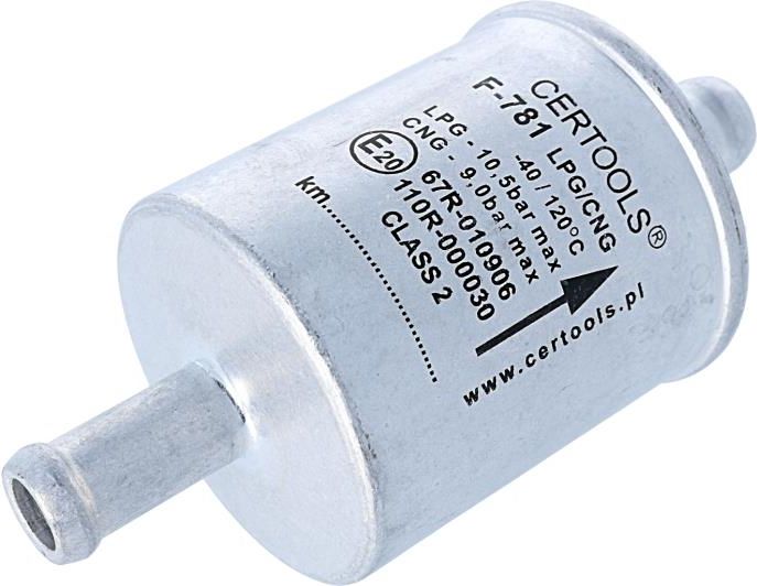 Opis produktu Jednorazowy filtr fazy lotnej model F-781 firmy Certools. Opis zastosowania Filtr fazy lotnej stosowany w układach sekwencyjnego wtrysku gazu w fazie lotnej. Dane techniczne Jednorazowy filtr w aluminiowym korpusie o długości całkowitej 98 milimetrów. Króćce przyłączeniowe o jednakowej średnicy 11 milimetrów, wkład filtrujący z poliestru, określony na obudowie kierunek przepływu gazu. Ciśnienie kwalifikacyjne 450 kPa, zakres zalecanej temperatury pracy od -40ᵒC do +120ᵒC. E20-67R-010906 E20-110R-000030 Cechy produktu Typ filtra: jednorazowy Wkład: poliester Wejście: 11 mm Wyjście: 11 mm Obudowa: metal Sposób montażu: na przewodzie Informacje dodatkowe Kod produktu Nagaz: 32.CRT.881 Producent: CERTOOLS Kod producenta: 55-781-01111NG Numer homologacji: E29-67R-010906