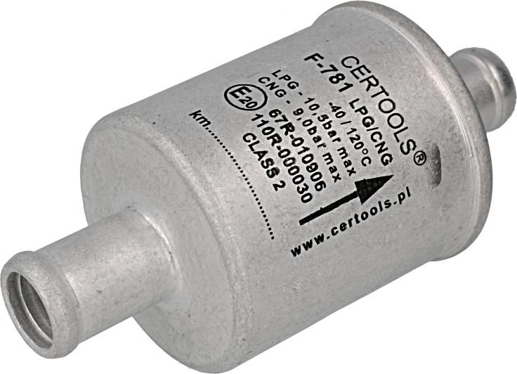 Opis produktu Jednorazowy filtr fazy lotnej model F-781 firmy Certools. Zalecana wymiana filtra co 20 000 km. Opis zastosowania Filtr fazy lotnej przeznaczony do instalacji czwartej generacji sekwencyjnego wtrysku gazu w fazie lotnej. Dane techniczne Jednorazowy filtr w aluminiowym korpusie o długości całkowitej 98 milimetrów. Króciec wejścia gazu o średnicy 16 milimetrów, króciec wyjścia gazu o średnicy 14 milimetrów, wkład filtrujący z poliestru bez siatki, określony na obudowie kierunek przepływu gazu. Ciśnienie kwalifikacyjne 450 kPa, zakres zalecanej temperatury pracy od -40 do +120 stopni Celsjusza. E20-67R-010906 E20-110R-000030 Cechy produktu Typ filtra: jednorazowy Wkład: poliester Wejście: 16 mm Wyjście: 14 mm Obudowa: metal Sposób montażu: na przewodzie Informacje dodatkowe Kod produktu Nagaz: 32.CRT.749 Producent: CERTOOLS Kod producenta: 55-781-01614NG Numer homologacji: E20-67R-010906