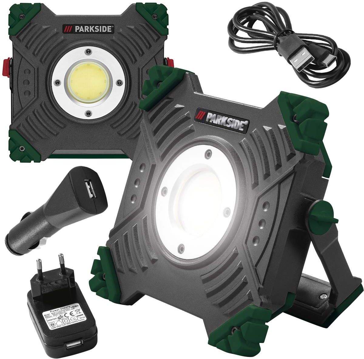 PARKSIDE® Akumulatorowy reflektor roboczy LED, PAAL 6000 C3, z funkcją powerbanku Strumień świetlny: ok. 2000 lm Temperatura barwowa: ok. 6500 K ✓ Rozkładana podstawka zapewniająca pewny chwyt ✓ Obudowa odporna na wstrząsy z gumowanymi krawędziami ✓ Z 2 portami USB Opis produktu lampa przenośna z funkcją USB power bank mocna dioda LED 20 W COB 4 tryby pracy: maks. jasność tryb oszczędny 50% sygnał SOS czerwone światło migające 2 porty USB i 1 wskaźnik stanu akumulatora pod pokrywą ochronną obudowa odporna na wstrząsy z gumowanymi krawędziami – odporna na strumień (IP65) rozkładana, magnetyczna podstawka zapewniająca pewny chwyt odpowiedni także do zawieszenia Parametry techniczne strumień świetlny: ok. 2000 lm czas świecenia reflektora: ok. 2 h (maks. jasność) / ok. 4 h (50% tryb oszczędny) - w zależności od warunków pracy czas świecenia w trybie migania: ok. 8 h (sygnał SOS) / ok. 60 h (czerwone światło migające) - w zależności od warunków pracy temperatura barwowa: ok. 6500 K moc wyjściowa USB: 5 V, 2,1 A moc wejściowa USB (typ C): 5 V, 2,0 A pojemność znamionowa powerbanku: 3500 mAh (przy 5 V, 2,1 A) odwzorowanie kolorów: 90 Ra moc całkowita: 20 W zasilanie: 1x akumulator litowo-jonowy, 11,1 V, 2000 mAh żywotność LED: 30 000 h czas ładowania: ok. 3,5 godz. Materiał aluminium, tworzywo sztuczne, guma Wymiary ok. 16,5 x 15 x 4,4 cm Waga ok. 700 g dołączone akcesoria: ładowarka sieciowa USB, ładowarka samochodowa 12V, kabel USB