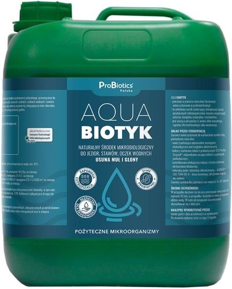 Właściwości: AQUABIOTYK to płynny, mikrobiologiczny środek pochodzenia naturalnego, przeznaczony do stosowania w zbiornikach wodnych: jeziorach, stawach, oczkach i ciekach wodnych. Zawiera pożyteczne mikroorganizmy, które żywią się materią organiczną zalegającą na dnie zbiornika. Przyspieszają one jej mineralizację i zatrzymują procesy gnilne. - Mineralizuje osady denne, - eliminuje gnicie i reguluje procesy mikrobiologiczne, - usuwa muł i glony, - poprawia pH wody, - optymalizuje natlenienie, - likwiduje nieprzyjemne zapachy, - przywraca przejrzystość wody, - zapobiega procesom eutrofizacji, - poprawia zdrowie i kondycję ryb. AQUABIOTYK: - powstaje w procesie naturalnej fermentacji wykorzystywanej w probiotechnologii, - to unikatowy wyrób zawierający: kompozycję żywych, pożytecznych mikroorganizmów, kwasów organicznych, witamin, kompleks minerałów i metabolitów, - jest cieczą o pH poniżej 4, koloru żółto-brunatnego, zapachu sfermentowanego soku owocowego. Sposób użycia: Stosujemy w sezonie od wiosny do jesieni, przy temperaturze wody min. 8oC. Zbiorniki wodne: - 1 ha i większe: pierwsza dawka 40 L/ha, następnie 10 L/ha, co miesiąc, - 1000-2500 m2: pierwsza dawka 10 L, następnie 2,5-5 L, co miesiąc, - mniejsze niż 1000 m2: pierwsza dawka 1 L/100 m2, następnie 0,5-1 L//100 m2, co miesiąc. Oczka wodne: nie więcej niż 0,3 L/m3 wody, co miesiąc. AQUABIOTYK należy równomiernie rozprowadzić po całej powierzchni zbiornika, w tym celu preparat można rozcieńczyć z wodą w stężeniu np. 1:20. Aplikować najlepiej przy brzegu lub z łódki używając opryskiwacza, wiadra, konewki. Składniki: Surowce wykorzystywane do wytworzenia wyrobu mają pochodzenie naturalne: - woda (spełniająca odpowiednie wymaganiatechnologiczne pod względem jakościowym), - kultury starterowe bakterii probiotycznych SCD ProBio Original®, indywidualne szczepy bakterii o potencjale probiotycznym, - certyfikowana ekologiczna melasa z trzciny cukrowej, - sól kamienna kłodawska, - naturalny puder mineralny mikronizowany – kwas krzemowy, sól glinowo-wapniowo-sodowa. Zawiera Lactobacillus plantarum nie mniej niż: 1 x 106 jtk/cm3.