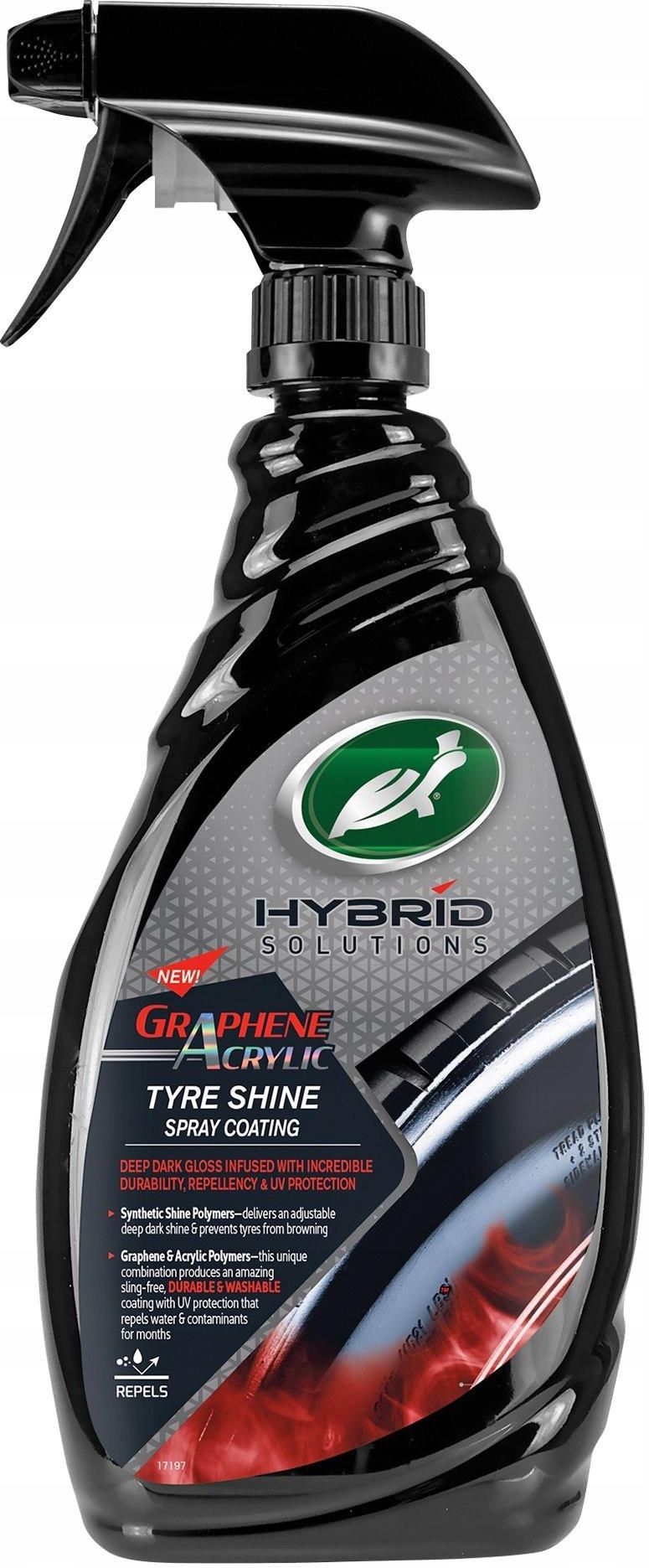 HYBRID SOLUTIONS TYRE SHINE GRAPHENE ACRYLIC 680ML Turtle Wax Hybrid Solutions Tyre Shine Graphene Acrylic to rewolucyjny produkt do konserwacji opon samochodowych, który zapewnia trwałość i ochronę przed szkodliwymi czynnikami zewnętrznymi, takimi jak promienie UV czy chemikalia, a przy tym jest wodoodporny. Formuła produktu oparta jest na zaawansowanym technologicznie grafenie oraz polimerach akrylowych, co gwarantuje niespotykany dotąd połysk i głęboki, kruczoczarny kolor na oponach. Syntetyczna formuła nabłyszczająca sprawia, że połysk jest regulowany, a opony nie brązowieją. Drobne cząsteczki grafenu wnikają w powierzchnię opony i łączą się z nią, co zapewnia większą trwałość produktu. Trwała i wysoce wydajna formuła utrzymuje się po myciu przez wiele miesięcy, dzięki czemu opony zawsze będą wyglądały pięknie i będą odpowiednio zabezpieczone. Produkt jest idealny dla osób, które cenią sobie profesjonalną opiekę nad swoim samochodem. Nabłyszczający spray Turtle Wax Hybrid Solutions Tyre Shine Graphene Acrylic to nie tylko gwarancja pięknie wyglądających opon, ale przede wszystkim ochrony i zabezpieczenia gumy. Jeśli chcesz, aby Twoje opony wyglądały jak nowe i były odpowiednio zabezpieczone przed działaniem szkodliwych czynników zewnętrznych, to jest to produkt dla Ciebie. Sposób użycia: Przygotuj opony - umyj powierzchnię opony i dokładnie ją osusz. Upewnij się, że opona jest czysta i sucha przed nałożeniem produktu. Wstrząśnij butelką - przed użyciem produktu wstrząśnij butelką, aby składniki dobrze się wymieszały. Spryskaj oponę - równomiernie spryskaj całą ścianę boczną każdej opony. Używaj produktu w umiarkowanych ilościach, aby uniknąć nadmiernego rozpylania. Pozostaw na czas 3-5 minut - po nałożeniu produktu pozostaw go na oponie na czas 3-5 minut. W tym czasie preparat powinien dokładnie wniknąć w powierzchnię opony. Usuń nadmiar preparatu - po upływie czasu 3-5 minut usuń nadmiar preparatu przy pomocy czystej ściereczki. Wycieraj oponę dokładnie, aby pozbyć się nadmiaru produktu i zabrudzeń. Nałóż drugą warstwę - jeśli chcesz uzyskać dodatkowy połysk * Zdjęcia poglądowe