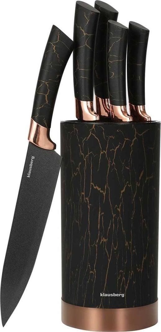 Zestaw 5 noży kuchennych w stojaku. Imitacja czarnego marmuru. noże wyprodukowane w wysokiej temperaturze, w zaawansowanym technologicznie procesie syntezy - ostrza cechuje długa żywotność bez konieczności ostrzenia wyposażone w ergonomiczne, antypoślizgowe uchwyty - wygodne i pewne trzymanie …