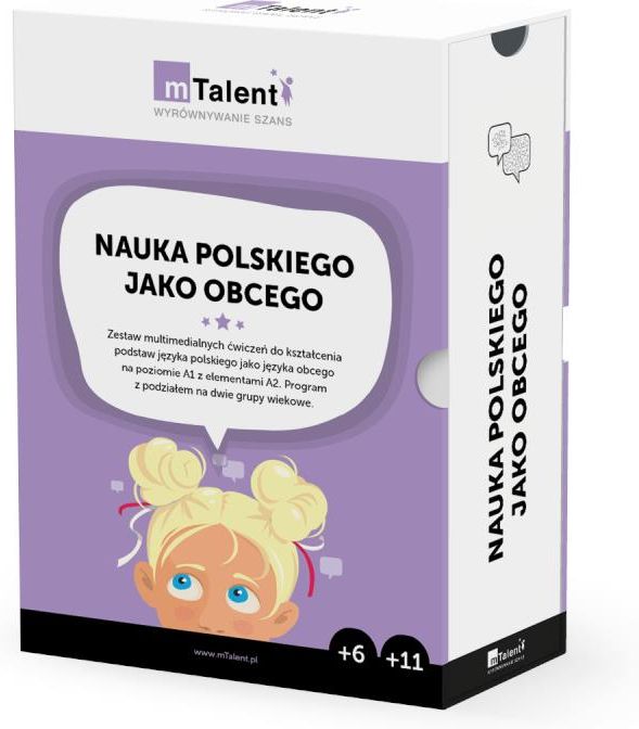 Specjalne potrzeby edukacyjne. mTalent Seria programów mTalent została zaprojektowana w celu wspomagania współczesnego terapeuty i nauczyciela w pracy z dziećmi ze specjalnymi potrzebami edukacyjnymi i rozwojowymi. Programy z serii mTalent to gotowe narzędzia diagnostyczno-terapeutyczne zawierające tysiące interaktywnych ćwiczeń, które z łatwością mogą zostać włączone w program zajęć dydaktyczno-wyrównawczych, rewalidacyjnych, logopedycznych i korekcyjno-kompensacyjnych. mTalent to stale rozwijająca się seria specjalistycznych programów i ćwiczeń wspierających terapię. Od momentu ich powstania baza ćwiczeń każdego programu jest stale powiększana, a co roku seria wzbogacana jest o kolejne pozycje, które odpowiadają na wszystkie potrzeby terapeutów, nauczycieli i ich podopiecznych. Wszystkie programy mTalent dostępne są na zasadzie licencji bezterminowej! Każdy program mTalent dostępny jest w programie dofinansowania Aktywna Tablica 2020-2024! Indywidualizacja i wybór mTalent to najnowsza i najbogatsza na polskim rynku seria programów wspierających terapię. W sumie oferuje ponad 22 tysiące interaktywnych ekranów! Największe doświadczenie na rynku Nad serią mTalent pracuje zespół, który jako pierwszy w Polsce wprowadził technologię do gabinetów logopedycznych i terapeutycznych. Udowodniona skuteczność Wartość merytoryczna programów serii mTalent, ich efektywność, niezawodność i przewagi konkurencyjne zostały potwierdzone w opiniach klinicznych. Najczęściej nagradzana seria mTalent to jedyny polski program wspierający terapię, który otrzymał nagrodę BELMA. mTalent to także jedyne multimedialne rozwiązania nominowane do Bett Awards i konkursu ERA. Status wyrobu medycznego Multimedialne programy mTalent uzyskały status wyrobu medycznego oraz pozytywną ocenę kliniczną, co gwarantuje ich skuteczność oraz bezpieczeństwo Bezterminowa licencja Wydawca serii mTalent udziela bezterminowej i wielostanowiskowej licencji na wszystkie produkty z tej serii. Co więcej, użytkownicy otrzymują także bezpłatne aktualizacje programów i materiały szkoleniowe. POTRAFIĘ. Obszar polonistyczny (klasy 4-6) Zestaw multimedialnych ćwiczeń do kształcenia podstaw języka polskiego jako języka obcego na poziomie A1 z elementami A2. Program z podziałem na dwie grupy wiekowe (klasy I-III i IV-VIII) Do wykorzystania na indywidualnych oraz grupowych zajęciach z języka polskiego jako obcego, a także na zwykłych lekcjach języka polskiego, na które uczęszczają uczniowie z niską znajomością języka polskiego (np. dzieci z doświadczeniem migracji). Blisko 1500 ekranów interaktywnych, ponad 150 kart pracy, przewodnik metodyczny oraz zestaw materiałów dodatkowych w jednym pudełku. Dla nauczycieli języka polskiego jako obcego, nauczycieli, którzy pracują z uczniami z doświadczeniem migracji oraz nauczycieli pracujących w oddziałach przygotowawczych, szczególnie gdy do takiego oddziału dołącza uczeń bez znajomości języka polskiego. Zawartość programu mTalent Nauka polskiego jako obcego utorskie publikacje (w tym poradnik metodyczny do programu i instrukcja tworzenia własnych zasobów) Blisko 1500 ekranów interaktywnych, ponad 150 kart pracy do wydruku Bezpłatne szkolenie zakończone wystawieniem certyfikatu Dostęp do centrum wsparcia technicznego i szkoleniowego mTalent Bezpłatne aktualizacje programu Zadania walidowane przez nauczycieli pracujących z uczniami z doświadczeniem migracji w Zespole Szkół Sportowych i Mistrzostwa Sportowego w Gdańsku oraz przez uczestników szkoleń dla nauczycieli organizowanych przez Fundację Razem w Polsce. MTalent Nauka polskiego jako obcego to multimedialny zestaw uzupełniający regularny podręcznik kursowy, który pomoże indywidualizować pracę odpowiednio do możliwości uczniów. Jest to narzędzie do wykorzystania przez nauczycieli i uczniów podczas kursu i zajęć, w tym także materiały samodzielnej pracy w domu (np. karty pracy), dwa zestawy ćwiczeń dostosowane do dwóch grup wiekowych (uczniów z etapu wczesnoszkolnego oraz uczniów starszych) na poziomie A1 z elementami poziomu A2, zestaw multimedialnych ćwiczeń do kształcenia podstaw języka polskiego jako języka obcego, zadania rozwijające kompetencje ogólne oraz komunikacyjne, zadania w zakresie sprawności słuchania, czytania, mówienia oraz pisania, zadania stworzone w oparciu o wieloletnią pracę z uczniami z doświadczeniem migracji (w tym również z uczniami-uchodźcami), ćwiczenia leksykalne ze słownictwem o wysokiej frekwencji, materiał zawierający najbardziej istotne tematy, które niezbędne są w codziennym funkcjonowaniu ze szczególnym uwzględnieniem rzeczywistości szkolnej, teksty i dialogi pozwalające rozumieć kontekst użytych wyrażeń oraz różnorodne ćwiczenia utrwalające wprowadzane słownictwo, teksty w wersji pisanej i do odsłuchania z symultanicznym podświetlaniem fragmentów, plansze tematyczne (np. rodzina, szkoła, ubrania), komentarze gramatyczne, zestawienia zwrotów komunikacyjnych oraz wiele różnorodnych ćwiczeń do poszczególnych części.
