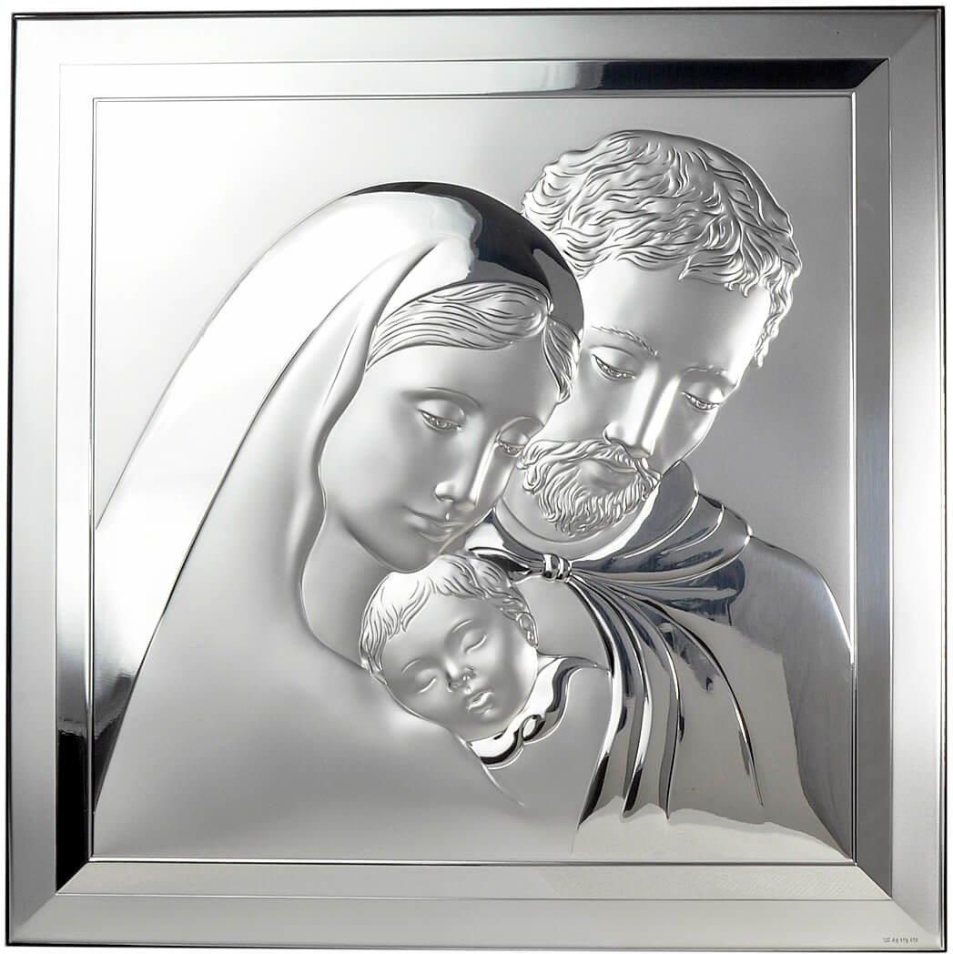Obrazek srebrny przedstawiający wizerunek Świętej Rodziny.Idealnie nadaje się z okazji Jubileuszu, Urodzin, Imienin, Ślubu oraz wielu innych.Obrazek wykonany jest z blachy dwu warstwowej aluminium i srebra. Zewnętrzna warstwa srebra pokryta jest zabezpieczającym lakierem, dzięki któremu produkt zachowa swój blask.Piękny obrazek laminowany srebrem z załączonym certyfikatem.Producentem jest włoska firma BELTRAMI będąca liderem wśród włoskich producentów wyrobów sakralnych. Do produkcji wykorzystany został innowacyjny metal szlachetny o nazwie MIRO-SILVER (nowoczesny surowiec pokryty warstwą czystego srebra 999,95 w procesie atomowym), opatentowany na terytorium Europy CMT 003290889.Prezentowany produkt jest odporniejszy na odkształcenia mechaniczne i śniedzenie, doskonale odbija światło, co podkreśla szlachetność srebra.Obrazek zapakowany jest w eleganckie pudełko.Do czyszczenia wystarczy miękka ściereczka lub ciepła woda, nie zaleca się stosowania środków chemicznych, również tych przeznaczonych do czyszczenia srebra, które mogą zniszczyć wierzchnią warstwę ochronną.Obrazek osadzony jest na lakierowanym drewnie.Obrazek o wymiarach 16 cm /16 cm można postawić lub zawiesić dzięki dołączonej do zestawu nóżce. Ilość: sztuki