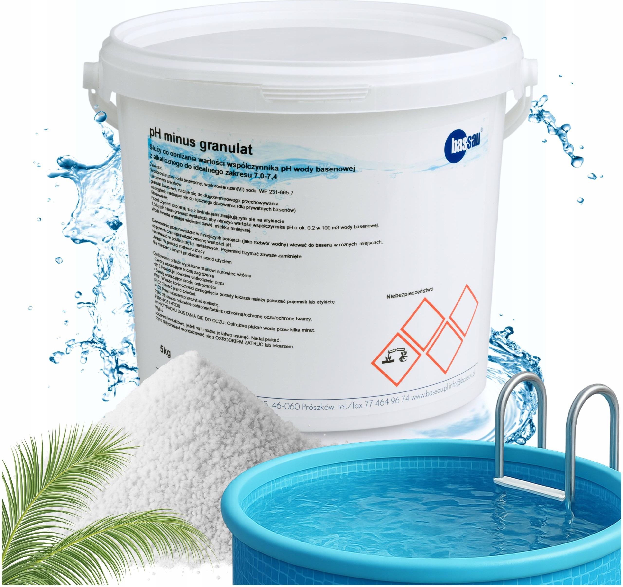 PH MINUS Granulat do Basenu Chemia Basenowa Regulator pH Wody 5 kg BASSAU Służy do obniżania wartości współczynnika pH w wodzie basenowej, z alkalicznego, do idealnego zakresu 7,0-7,4. PH MINUS Granulat 5kg ⭐️ Działanie Granulat kwasowy precyzyjnie obniża wartość pH wody basenowej z zakresu alkalicznego (powyżej 7,4) do optymalnego poziomu 7,0–7,4. Dzięki temu: ✅ Woda staje się przyjemniejsza dla skóry i oczu. ✅ Zapobiegasz osadzaniu się kamienia i zmętnieniu wody. ✅ Poprawiasz skuteczność pracy środków dezynfekcyjnych (chlor, aktywny tlen). ⭐️ Zastosowanie Idealny do: Prywatnych basenów ogrodowych Spa i małych kąpielisk Ręcznego dozowania w instalacjach o dużej zmienności parametrów wody ⭐️ Zalety produktu Brak chlorków – nie powoduje korozji elementów basenu. Forma granulatu – szybkie rozpuszczanie i łatwe dozowanie. Długa trwałość – stabilny chemicznie, może być przechowywany przez wiele sezonów. Ekonomiczne pakowanie – 1,5 kg wystarcza na obniżenie pH o 0,2 w 100 m³ wody. ⚙️ Instrukcja użycia Przygotowanie roztworu: Rozpuść odpowiednią ilość granulatu w wiadrze z wodą. Dozowanie: Wlewaj roztwór w kilku miejscach wzdłuż krawędzi basenu. Kontrola pH: Po 30–60 min zmierz wartość pH i w razie potrzeby powtórz dawkę. Typowa dawka: 1,5 kg granulatu → obniżenie pH o 0,2 w 100 m³ wody. Woda twarda ▶️ większa dawka Woda miękka ▶️ mniejsza dawka ❗Bezpieczeństwo H318 – Powoduje poważne uszkodzenie oczu! Roztwór żrący – stosować środki ochrony: okulary, rękawice. Nie wlewać bezpośrednio na metalowe elementy basenu. W razie kontaktu ze skórą/oczami – natychmiast przepłukać dużą ilością wody i zasięgnąć porady lekarza. ❗Przechowywanie Przechowywać w oryginalnym, szczelnie zamkniętym opakowaniu. Chronić przed wilgocią i bezpośrednim nasłonecznieniem. Trzymać z dala od dzieci i zwierząt.