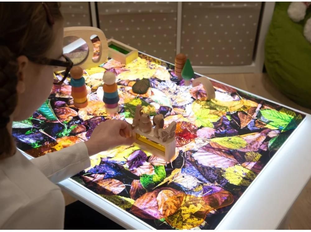 Mata do panelu A2 – Jesień Przenieś się w jesienną aurę pełną barwnych liści wraz z Matą do panelu A2 – Jesień . Ta niezwykła plansza zawiera bardzo szczegółowy obraz liści o różnorodnych kształtach i kolorach. Stanowi doskonałą bazę do odgrywania scen z użyciem drobnych elementów, np. kształtów i liter oraz figurek zwierząt, postaci, grzybków i pojazdów. Dziecko może wcielać się w różne role i stawać się bardziej kreatywne, co w przyszłości przyda mu się w rozwiązywaniu problemów. Zabawa Matą do panelu A2 – Jesień to dobry sposób na poszerzanie słownictwa dziecka w zakresie pór roku oraz przyrody. To również fantastyczna okazja do uczenia go budowania zdań w ciągu przyczynowo-skutkowym. Maluch doskonali w ten sposób zauważanie zależności między wydarzeniami oraz zdolność logicznego myślenia. Mata Jesień jest zaprojektowana tak, aby pasowała do panelu świetlnego A2. Ze względu na swoje półprzezroczyste właściwości sprawdza się szczególnie dobrze na panelu LED lub podświetlanym stole. Przenikające ją światło wydobywa i eksponuje obrazy na macie, a wybrane źródło koloru będzie miało różny wpływ na ich wygląd. Może zmieniać niektóre barwy scenerii, wzmacniać je albo nawet sprawiać, że niektóre elementy będą wydawały się fluorescencyjne. Zabawy świetlne to doskonały sposób na oswajanie dziecka z ciemnością oraz stymulowanie percepcji wzrokowej. Matą do panelu A2 – Jesień została wykonana z trwałego poliestru. Jest odporna na zużycie i łatwa do czyszczenia. [ikony-produktu-opisy] Co zawiera? 1 sztuka Główne informacje Wiek: 0+ Wymiary: 63,5 x 46 cm Materiał: poliester Wykonana z trwałego poliestru mata jest odporna na zużycie i łatwa do czyszczenia Pomysły na zabawę Obserwacja ze zmiennym źródłem światła: wzrok, słownictwo opisowe, rozróżnianie kolorów Mata po podświetleniu różnymi kolorami może zmieniać barwy wybranych elementów, uwypuklać je lub sprawiać, że staną się fluorescencyjne. Podświetlaj matę na panelu lub przy pomocy innego źródła światła. Zmieniaj jego kolory i zachęcaj dziecko do obserwacji oraz dzielenia się spostrzeżeniami. Znajdź przedmiot: percepcja wzrokowa, koncentracja uwagi Rozłóż matę na panelu i ją podświetl. Wybierz z dzieckiem elementy, które na niej umieścisz, np. figurki zwierząt, kamienie, liście, plastikowe grzyby itp. Ćwiczenie polega na zadawaniu dziecku poleceń dotyczących ukrytych w liściach przedmiotach, np. znajdź dwa muchomory, znajdź 3 kamyki itp.