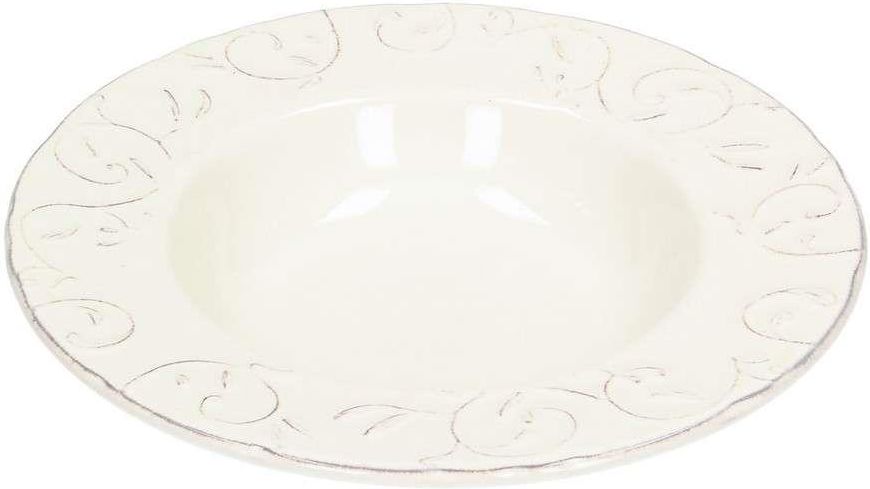 Talerz głęboki Glenys ⌀24cm, ⌀ 24 cm Głęboki talerz ceramiczny o subtelnym kwiatowym wzorze. Talerz z ceramiki w delikatny, kwiatowy wzór. Subtelny, kremowy kolor nadaje mu wyjątkowego charakteru. Pięknie zaprezentuje się na każdym stole. Doskonale sprawdzi się w serwowaniu ulubionych ciepłych potraw np. zup czy past. Głęboki talerz wspaniale zaprezentuje się z innymi naczyniami z tej samej serii. Zdobienie pokryte patyną. Wymiary: szer. 24 cm, dł. 24 cm, wys. 4,5 cm. Dane produktu Waga: 0.53kg Rozmiar: ⌀ 24 cm Materiał: ceramika Elementy zastawy stołowej: miseczka/ talerz głęboki Seria: Glenys