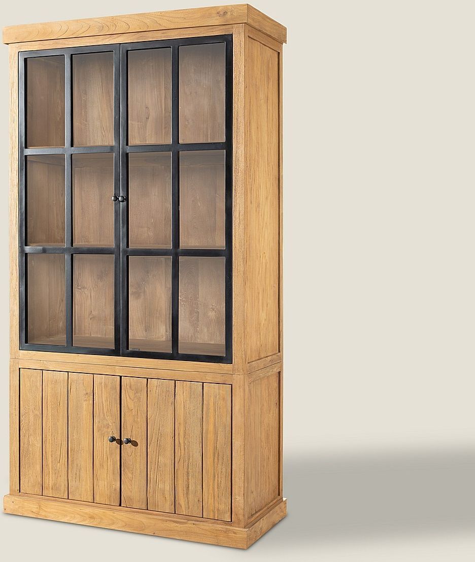 Duża witryna z przeszklonymi drzwiami z recyklingowanego drewna tekowego i metalu. Solidna witryna z kolekcji Harbor to wyjątkowe połączenie naturalnego drewna tekowego z odzysku i czarnej metalowej ramy. Jej szeroka bryła zapewnia dużą przestrzeń ekspozycyjną i praktyczne miejsce do przechowywania. Górna część z podwójnymi, przeszklonymi drzwiami i wyraźnym, metalowym podziałem nadaje meblowi industrialny charakter. Dolna część wyposażona w pełne drzwiczki z pionowych desek zachowuje styl rustykalny i skrywa mniej reprezentacyjne przedmioty.To mebel idealny do salonu, jadalni lub przestronnej kuchni w stylu rustykalnym, loftowym czy boho. Ciepły odcień drewna tekowego ociepla wnętrze, a surowy akcent metalu nadaje mu współczesnej formy. Witryna pomieści porcelanę, książki, dekoracje lub tekstylia domowe, zachowując porządek i styl w jednym.Cała kolekcja Harbor obejmuje również inne meble, które razem stworzą spójną i elegancką aranżację salonu, jadalni lub gabinetu.Wymiary: szer. 114 cm, gł. 53 cm, wys. 220 cmMateriał: drewno tekowe z recyklingu, metalKolor: naturalne drewno tekowe / czarna rama