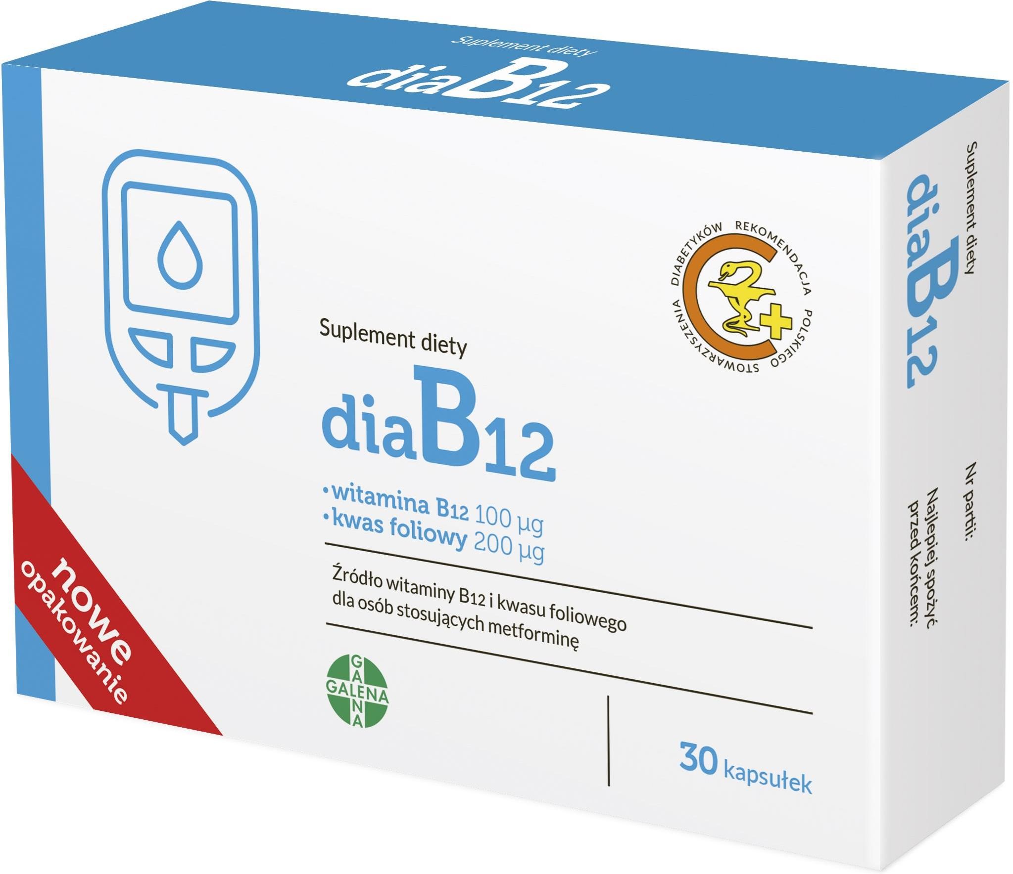 diaB12, 30 kapsułek Suplement diety. Źródło witaminy B12 i kwasu foliowego dla osób stosujących metforminę Uzupełnienie niedoborów witaminy B12 i kwasu foliowego u osoób stosuących metforminę.Skład 1 kapsułki: Kwas foliowy 200ug Witamina B12 100ug Sposób użycia: Dorośli 1 kapsułka dziennie w czasie posiłku. Przeciwskazania: Nadwrażliwość na cyjanokobalaminę, kobalt lub pozostałe składniki preparatu. Środki ostrożności: Nie stosować u kobiet w ciąży i karmiących. Ostrożnie stosować u pacjentów z chorobą Lebera, gdyż preparat może przyspieszyć zanik nerwu wzrokowego. Przechowywanie: Przechowywać w oryginalnym opakowaniu w temperaturze 15-25°C w miejscu niedostępnym dla małych dzieci. Chronić przed światłem i wilgocią. Ważne jest prowadzenie zdrowego trybu życia i zrównoważonego sposobu żywienia. Suplement diety nie może być stosowany jako substytut zróżnicowanej diety. Opakowanie: 30 kapsułek