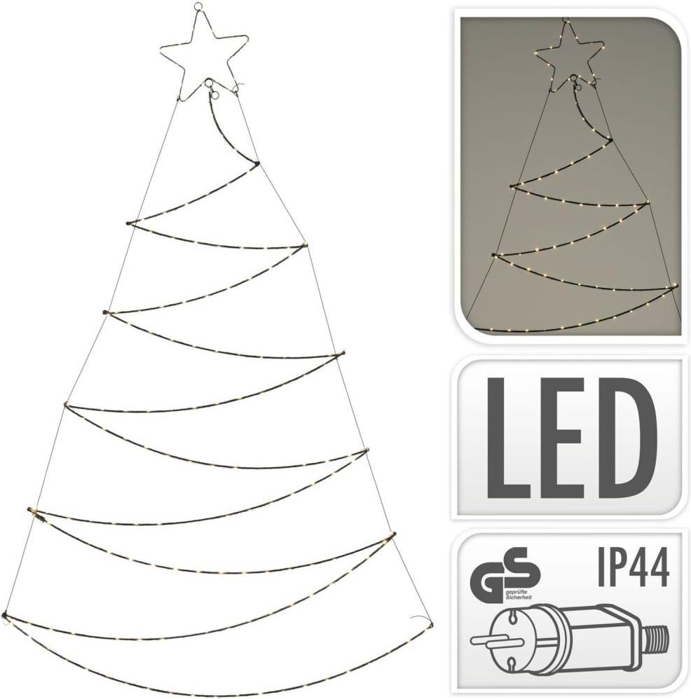 Choinka z gwiazdą świecąca wisząca / ozdoba zewnętrzna na elewację budynek dom 150 led 150 cm ŚWIĄTECZNA - Choinka świecąca z czubkiem w kształcie gwiazdy. Choinka ma wymiary 89 x 150 cm. Do zastosowania wewnątrz i na zewnątrz pomieszczeń. Nada magicznej atmosfery w świątecznym okresie. METALOWA - Wykonana z metalu w kolorze czarnym. OŚWIETLENIE LED - Gwiazdę oświetlają lampki LED o ciepłej barwie - 150 sztuk. Zasilanie sieciowe, kabel o długości 5 m. EFEKTOWNA - Dzięki dużym rozmiarom świetnie prezentuje się na elewacjach budynków - domów, biur, restauracji itd. BEZPIECZNA - Odporna na warunki atmosferyczne - IP44. Lampki posiadają certyfikat CE. Świecąca choinka z czubkiem w kształcie gwiazdy. Idealna do umieszczenia na elewacji budynków i domów. Choinka zawieszona robi niesamowite wrażenie. Niezwykła ozdoba na czas Świąt Bożego Narodzenia. Stworzy niepowtarzalny klimat w domu, ogrodzie, biurze lub tarasie. Choinka prezentuje się bardzo efektownie i nada świątecznego klimatu w każdym miejscu w którym zostanie umieszczona. Wyprodukowano zgodnie z europejskimi standardami.