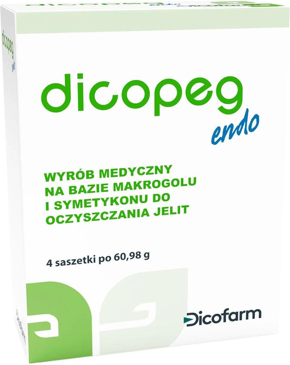 Dicopeg Endo Si proszek oczyszcza jelita – przygotowanie do badań Dicopeg Endo Si to wyrób medyczny do stosowania w celu oczyszczenia jelit, pomaga w usunięciu stałych resztek z okrężnicy. Działanie takie ma zasadnicze znaczenie dla właściwego przygotowania się do badań endoskopowych, radiologicznych i ultrasonograficznych. Proszek zawiera makrogol 3350, obojętną substancję, która się nie wchłania, nie drażni błony śluzowej, nie ulega fermentacji i jest wydalana w niezmienionej postaci. Skład Co zawiera Dicopeg Endo Si, proszek? Składniki: Makrogol 3350, symetykon. Substancje pomocnicze: dwutlenek krzemu, aromat, sól sodowa sacharyny. Nie zawiera glutenu. Charakterystyka produktu Jakie właściwości mają składniki proszku Dicopeg Endo Si? Proszek do sporządzania roztworu doustnego z makrogolem i symetykonem Makrogol 3350 jest obojętną substancję, która się nie wchłania, nie drażni błony śluzowej, nie ulega fermentacji i jest wydalana w niezmienionej postaci. Zatrzymuje dużą objętość płynów, nawadnia masy kałowe i pobudzając perystaltykę. W efekcie ułatwia wypróżnienia, oczyszcza jelita i pomaga przygotować się do badań endoskopowych, radiologicznych i ultrasonograficznych. Symetykon ułatwiaj eliminację gazu z przewodu pokarmowego. Sposób użycia Jak stosować Dicopeg Endo Si? W celu oczyszczenia jelit i przygotowania się do badań endoskopowych, radiologicznych i ultrasonograficznych: rozpuść zawartość 2 saszetek w 1 litrze wody przygotowany roztwór wypij w ciągu 1–2 godzin (np. po 250 ml co 10–15 min) dodatkowo wypij 500 ml wody powtórz procedurę dla kolejnych 2 saszetek – łącznie 2 litrów roztworu i 1 litra wody. Stosując preparat, pamiętaj perystaltyka i parcie na stolec zacznie się po przyjęciu pierwszego litra wypróżnienia będą stopniowo stawać się bardziej płynne uzyskania wydalania przezroczystego płynu bez resztek kałowych, wskazuje na poprawne przeprowadzenie oczyszczania i na gotowość do wykonania badania. Dodatkowe Nienaruszone opakowanie należy przechowywać w suchym miejscu, z dala od źródeł światła i ciepła, w temperaturze nieprzekraczającej 25°C. Ostrzeżenia To jest wyrób medyczny. Używaj go zgodnie z instrukcją używania lub etykietą. Roztwór do stosowania doustnego musi być sporządzony w chwili jego przyjmowania. Jeżeli nie zostanie przyjęty natychmiast, powinien być przechowywany w lodówce i bezwzględnie zużyty w ciągu 24 godzin od sporządzenia. Nie dodawać innych składników do przygotowanego roztworu. Nie stosować u dzieci < 2 lat lub < 20 kg masy ciała. Nie stosować w przypadku: niedrożności/perforacji jelit, silnych bólów brzucha o nieznanej etiologii, krwawienia z odbytu, nudności i wymiotów, poważnych chorób zapalnych przewodu pokarmowego, takich jak choroba Leśniowskiego-Crohna, wrzodziejące zapalenie jelita grubego i ostre rozdęcie okrężnicy. Nie stosować przy nadwrażliwości na którykolwiek składnik. Może wpływać na wchłanianie leków – zachować odstęp min. 2 godziny między stosowaniem. W przypadku reakcji alergicznych (wysypka, świąd, pokrzywka) należy przerwać stosowanie i skonsultować się z lekarzem. Możliwe działania niepożądane: biegunka, ból brzucha, wzdęcia, nudności, wymioty. Produkt należy stosować wyłącznie pod ścisłym nadzorem lekarza w przypadku klinicznej hiponatremii w wywiadzie lub stanów mogących zwiększać ryzyko hiponatremii (choroby nerek, układu krążenia, wątroby, stosowanie leków moczopędnych, wiek geriatryczny itp.). Produkt nie zawiera soli. Należy skonsultować z lekarzem konieczność uzupełniania soli, w celu uniknięcia zaburzeń równowagi elektrolitowej (hiponatremii). Należy zgłosić lekarzowi wszelkie istotne schorzenia, w szczególności choroby sercowo-naczyniowe, dysfagię, refluks żołądkowo-przełykowy, padaczkę lub drgawki mięśniowe w wywiadzie, alkoholizm, chorobę nerek, zaburzenia równowagi elektrolitowej w osoczu. Zawartość opakowania 4 saszetki po 60,98 g