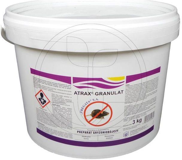 Atrax granulat to skuteczny preparat gryzoniobójczy w formie garnulatu. Produkt polecany w przypadku zwiększonej odporności gryzoni na preparaty oparte na antykoagulantach I generacji. Preparat służy do powszechnego i profesjonalnego zwalczania myszy i szczurów wewnątrz i wokół budynków na terenach otwartych (parki, boiska, place zabaw, korty tenisowe, kempingi itp) oraz na wysypiskach śmieci. Skuteczność preparatu już po jednym pobraniu przez gryzonia. Preparat zawiera silnie gorzką substancję zniechęcającą do spożycia przez ludzi. Produktów biobójczych należy używać z zachowaniem środków ostrożności. Przed każdym użyciem należy przeczytać etykietę i informacje dotyczące produktu. Preparat należy wykładać do karmników deratyzacyjnych odpowiednio zabezpieczonych po 200 g w odstępach: - co 10-15 m w przypadku zwalczania szczurów - co 1,5 - 2 m przy zwalczaniu myszy Spożyty preparat uzupełniać na bierząco do momentu całkowitego wytępienia gryzoni - 6 do 10 dni. Efekt stosowania preparatu widoczny jest po 5-7 dniach