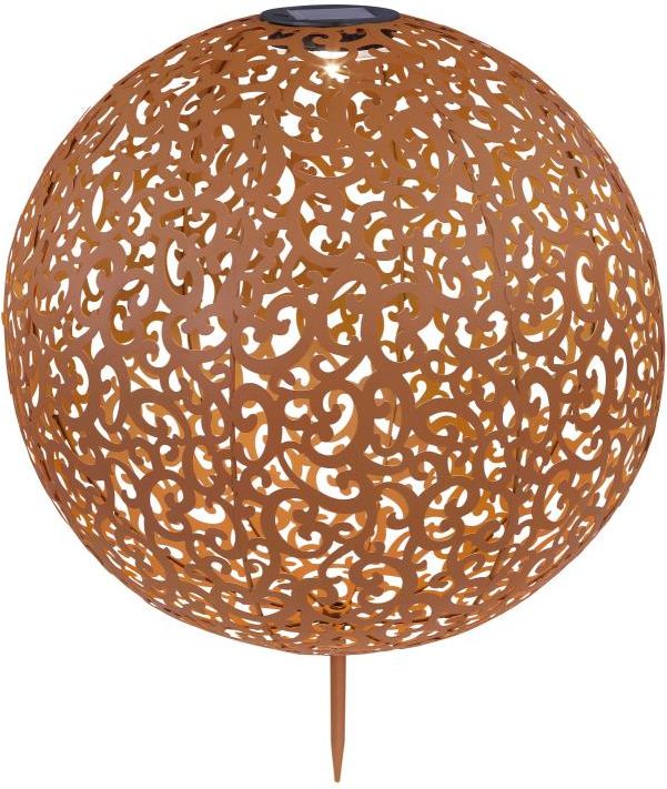 Dane: Lampa solarna metal w kolorze rdzawym kula z dekorem IP44 zaw. Baterie 300mAh 3,7V Szer:400 Wys:500 zaw. 1xLED 0,12W 3V 3000K Dane techniczne Średnica (mm): 400 Wysokość (mm): 500 Baterie w komplecie: Tak