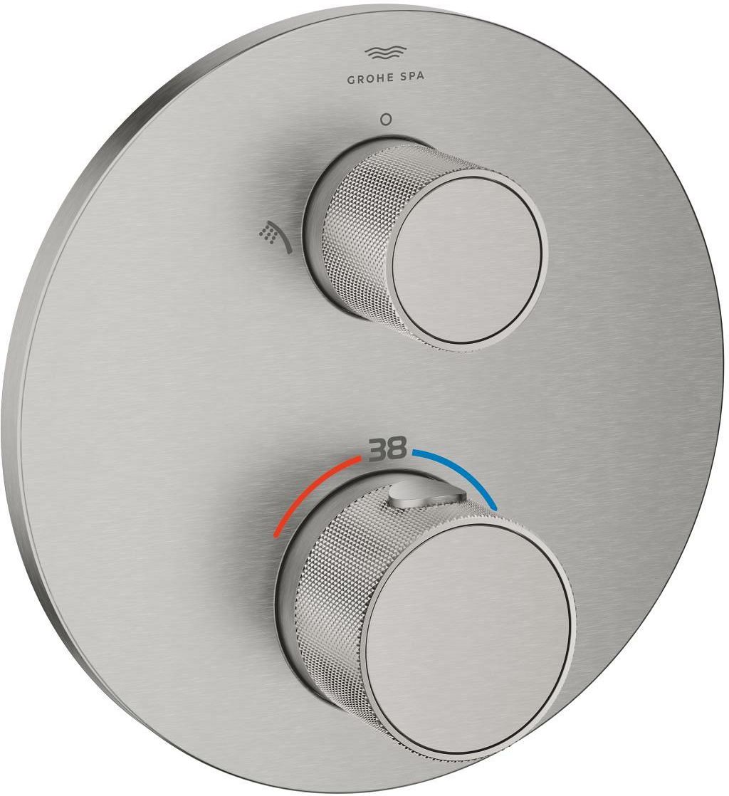 do montażu z elementem podtynkowym (zamawiany osobno): GROHE Rapido SmartBox uniwersalny element montażowy(35 600 000/35 604 000) GROHE TurboStat głowica termostatyczna GROHE Long-Life trwała powłoka GROHE FastFixation rozeta ścienna (z uszczelnieniem, zakryte mocowania) metalowa rozeta ścienna, regulacja 6° nadrukowane symbole deszczownicy i słuchawki prysznicowej GROHE SafeStop blokada na 38°C GROHE SafeStop Plus w zestawie opcjonalny ogranicznik temperatury 43°C / 46°C GROHE Aquadimmer: regulacja strumienia przepływu, przełącznik pomiędzy wyjściami wody pokrętła z metalowymi wkładkami do zastosowania z wkładkami 48 466 000 lub 48 467 000 wydajność przepływu:wyjście: B = 27 l/min wyjście: C = 30 l/min element montażowy zamawiany osobno