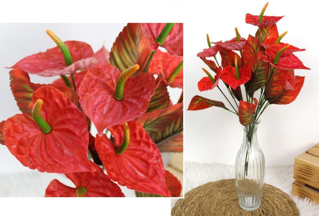 Bukiet ANTURIUM JESIENNE 40 cm – 12 kwiatów jasno czerwonych Elegancki bukiet anturium jesienne to efektowna dekoracja, która podkreśli wyjątkowy charakter wnętrz oraz aranżacji okolicznościowych. Bukiet ma 40 cm wysokości i składa się z 12 kwiatów o wymiarach 9 × 6,5 cm każdy. Jasno czerwony kolor nadaje mu subtelnej elegancji i sprawia, że świetnie komponuje się z innymi ozdobami. Wykonany z trwałych materiałów, zachowuje świeży i naturalny wygląd przez długi czas, bez konieczności pielęgnacji. Doskonale sprawdzi się jako ozdoba salonu, biura, restauracji czy w kompozycjach nagrobnych. Specyfikacja produktu: wysokość: 40 cm, liczba kwiatów: 12, wymiary kwiatów: 9 × 6,5 cm, kolor: jasno czerwony, trwałe i estetyczne wykonanie. Zalety: naturalny i elegancki wygląd, jasno czerwony odcień – idealny na jesienne aranżacje, trwała dekoracja, która nie wymaga pielęgnacji, uniwersalne zastosowanie – do wnętrz, kompozycji stołowych i florystyki okolicznościowej, odporny na działanie czasu i warunków atmosferycznych. Bukiet anturium jesienne jasno czerwony 40 cm to elegancka ozdoba, która wniesie do Twoich aranżacji świeżość, kolor i ponadczasowy styl.