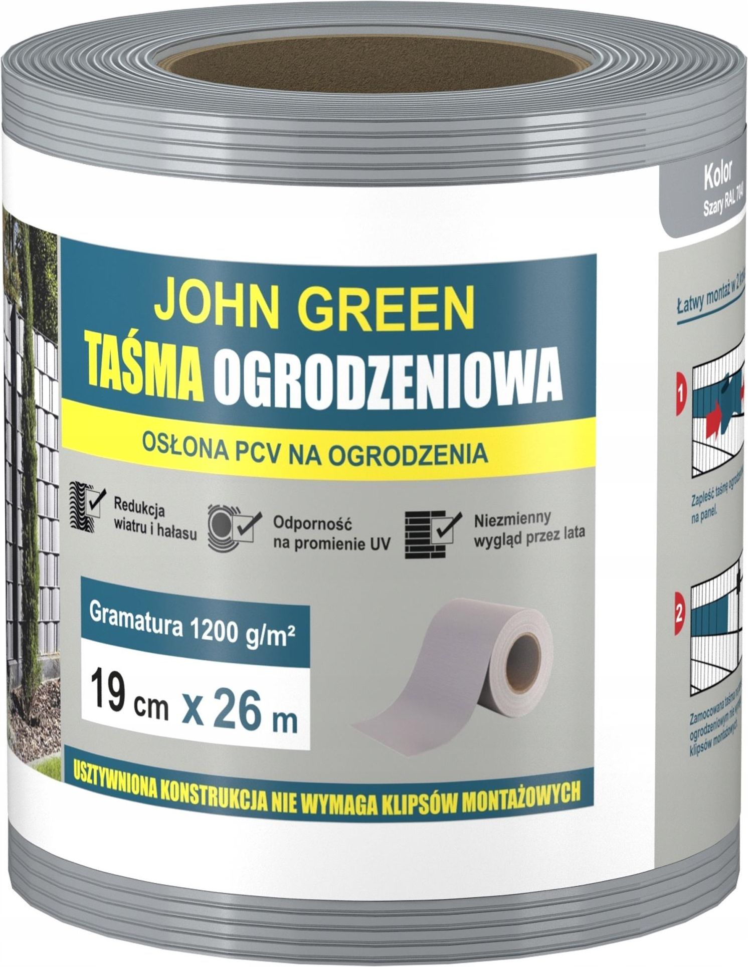 TAŚMA OGRODZENIOWA PREMIUM SZARY 19cmx26m ⭐️ TAŚMA OGRODZENIOWA PREMIUM SZARY 19cmx26m Odporność taśmy ogrodzeniowej na UV potwierdzona dokumentem w akredytowanym laboratorium. Wynik w skali szarości po ekspozycji na światło standardowe D65 - "4-5" (skala 1-5 liczona według norm ISO 105-A02:1993) Taśma odporna na warunki atmosferyczne tj. wilgoć, promienie słoneczne, deszcz, niskie i wysokie temperatury Taśma ogrodzeniowa zabezpieczona dodatkową powłoką zabezpieczającą przed odbarwieniami oraz kruszeniem materiału To znakomite rozwiązanie do osłony balkonu, ogrodzenia, płotu. Dzięki dodatkowym klipsom w zestawie taśmy zamontujesz w bardzo łatwy sposób na ogrodzeniu czy balkonie. W bardzo szybki sposób uwolnisz się od ciekawskiego wzroku sąsiada, nareszcie twoje, podwórko balkon czy kawałek działki będzie twoim prywatnym zakątkiem. ⭐️ Specyfikacja: Gramatura materiału: 1200g/m² Długość taśmy: 36m (+/- 5%) Wysokość: 19cm Materiał wykonania: PVC (polichlorek winylu) Waga netto: 6,8kg Kolor: Szary ⭐️ Poczucie prywatności Materiał, który posłużył do produkcji taśm ogrodzeniowych JohnGreen jest bardzo wysokiej gęstości aż 1200g/m². Dzięki temu żadne ciekawskie oko nie zobaczy, co dzieje się po drugiej stronie "płotu". ⭐️ Redukuje hałas oraz podmuchy wiatru Taśmy ogrodzeniowe nie tylko doskonale zacieniają ogrodzenia, ale również znacząco ograniczają podmuchy wiatru i dobiegający zza płotu hałas. ⭐️ Odporne na UV – potrójna stabilizacja Materiał, z którego wykonane są taśmy pokryty został specjalnymi filtrami UV oraz powłoką ochronną, które zabezpieczają strukturę tworzywa przed blaknięciem koloru oraz kruszeniem się. Dzięki potrójnej stabilizacji naszym taśmom ogrodzeniowym nie straszne są zmienne temperatury, deszcz czy ulewa, a nawet silny wiatr. ⭐️ Łatwe w czyszczeniu Ogromną zaletą osłon jest odporność na brud, dzięki czemu zwykle nie wymagają dodatkowej impregnacji czy zabiegów czyszczenia. W przypadku zabrudzeń takich jak zachlapanie czy kurz wystarczy przetrzeć je mokrą szmatką. ⭐️ Zwiększona grubość Taśmy ogrodzeniowe o gramaturze aż 1200g/m² są na tyle solidne i mocno trzymają się ogrodzenia, że nie wymagają użycia klipsów. Tak duża grubość pozwala na zastosowanie taśmy w panelach bez dodatkowego zabezpieczenia w postaci klamry, dzięki czemu montaż staje się jeszcze bardziej szybki i prosty. ⭐️ Przykładowe zastosowanie: Panele ogrodzeniowe Balustrady balkonowe Ogrodzenia siatkowe Wiaty śmietnikowe ⭐️ Najważniejsze cechy produktu: Uniwersalne wymiary Znacznie większa grubość niż standardowe taśmy Łatwość w montażu - produkt zainstalujesz bez potrzeby użycia klipsów Zapewnia poczucie prywatności i dyskrecję na posesjach Zabezpiecza przed nawiewaniem śniegu oraz redukuje silne podmuchy wiatru Odpowiednie usztywnienie redukuje możliwość przemieszczania się, zapewnia stabilność Odporny na promieniowanie UV Odporny na warunki atmosferyczne (wilgoć, niska temperatura) Redukuje hałas Nie wymaga konserwacji ⭐️ Taśmy ogrodzeniowe JohnGreen mają niezwykle szerokie zastosowanie, doskonale sprawdzą się do: Zacienienia i zamaskowania ogrodzenia lub płotu Zacienienia tarasu lub altany Zacienienia parkingu i podjazdu samochodowego Ochrony przed nagrzewaniem samochodu pod domem Ochrony roślin przed nadmiernym nasłonecznieniem lub gradem przy zachowaniu odpowiedniej cyrkulacji powietrza Ochrony roślin przed przemarznięciem Ochrony przed silnym, zacinającym deszczem Ochrony drzew owocowych przed ptactwem Ochrony prywatności Osłony podwórka przed wzrokiem przechodniów czy też sąsiadów Zabezpieczenia ogrodzeń obiektów sportowych, np. boisko, kort tenisowy czy pole do paintballa Ochrony w szkółkach ogrodniczych oraz w leśnictwie Taśma ogrodzeniowa doskonale wkomponuje się w aranżację zarówno nowoczesnego ogrodu, jak i w tradycyjnych projektach. Skuteczne zakryje również niezbyt estetyczne ogrodzenie z zewnątrz eksponując ładny i schludny wygląd. Co więcej, inwestując w taśmę ogrodzeniową, unikniemy uwag, dotyczących tych sfer ogrodu, które nie cechują się stuprocentowym porządkiem. Jeżeli więc zależy nam na tym, aby nikt nie zaglądał do naszej prywatnej przestrzeni, możemy wykorzystać wszechstronne zastosowanie taśmy ogrodzeniowej.