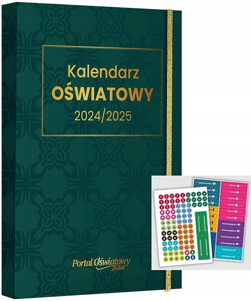 Kalendarz Oświatowy 2024/2025 Najnowsze wydanie Kalendarza Oświatowego 2024/2025!Znajdziesz w nim konkretne daty, obowiązki do wykonania oraz podstawę prawną każdego z nich. Każdy miesiąc podzielony jest na tematykę związaną ze sprawami kadrowymi, bezpieczeństwem, nadzorem oraz organizacją pracy szkoły ? dzięki temu nic nie ujdzie Twojej uwadze! Uzupełnieniem terminarza są plany lekcji, listy kontrolne, miejsca na swoje zapiski i notatki oraz łamigłówki i ciekawostki, a także strona www z dodatkowymi, przydatnymi w codziennej pracy materiałami. Kalendarz zawiera również dodatkowe naklejki do planowania. Najnowsze wydanie Kalendarza Oświatowego 2024/2025!Znajdziesz w nim konkretne daty, obowiązki do wykonania oraz podstawę prawną każdego z nich. Każdy miesiąc podzielony jest na tematykę związaną ze sprawami kadrowymi, bezpieczeństwem, nadzorem oraz organizacją pracy szkoły ? dzięki temu nic nie ujdzie Twojej uwadze! Uzupełnieniem terminarza są plany lekcji, listy kontrolne, miejsca na swoje zapiski i notatki oraz łamigłówki i ciekawostki, a także strona www z dodatkowymi, przydatnymi w codziennej pracy materiałami. Kalendarz zawiera również dodatkowe naklejki do planowania.