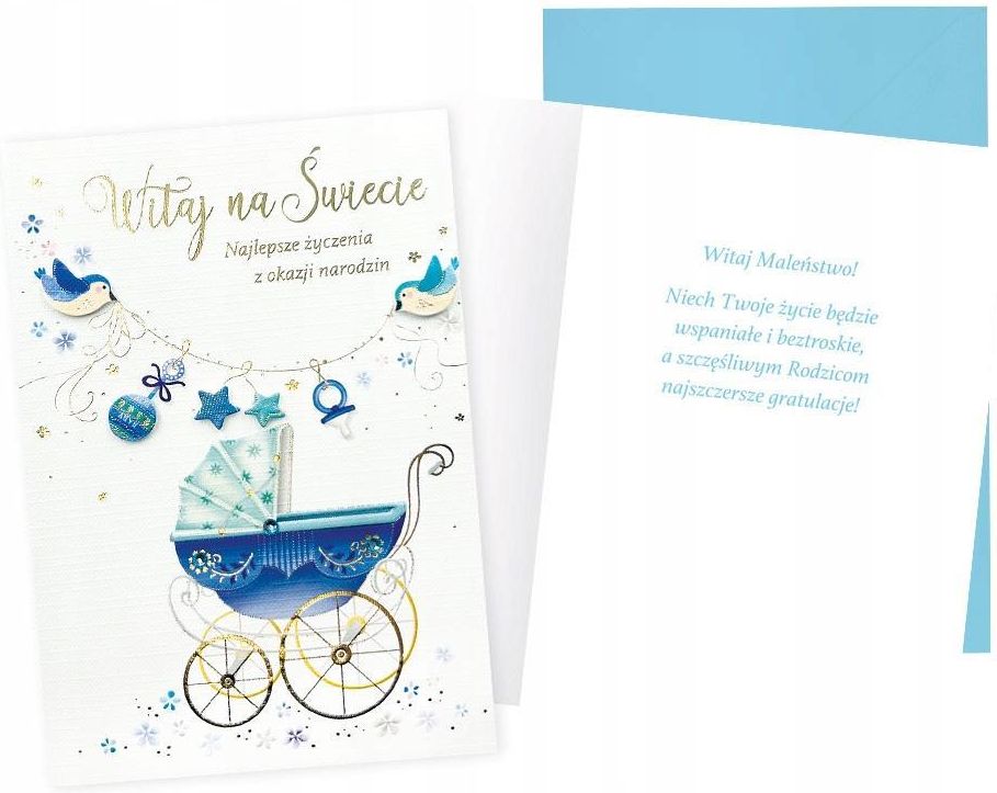 Kartka B6 z ozdobnej serii Dream Cards na narodziny dla chłopca - nieduża, ale robi wrażenie dzięki atrakcyjnej kolorystyce i ciekawym zdobieniom. To idealny wybór łączący przyjazną cenę z jakością. Cechy szczególne: wielkość: B6, 16.6 x 11.7 cm po złożeniu, koperta: w zestawie, kolorowa, zdobienia: kolorowe, różnorodne, bogate (w zależności od wzoru: przyklejane dekoracje, elementy biżuteryjne, odstawniki, brokat metaliczne folie, tłoczenia itp.), okazja: narodziny