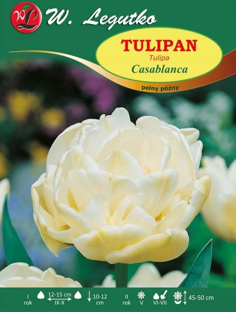 PRZEDSPRZEDAŻ! Wysyłka po 10.09.2023 r. Tulipan - Casablanca - pełny - późny - biały - 5sz Kolor: biały Termin sadzenia: IX-X Termin kwitnienia: V Postać produktu: cebulki Głębokość sadzenia: 10-12 cm Stanowisko: słoneczne Wysokość rośliny: 45-50 cm Grupa: pełny - późny Liczba sztuk w opakowaniu: 5 …