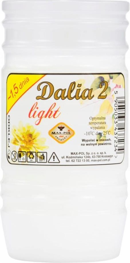 Wkład parafinowy do znicza DALIA LIGHT 2 – 1,5 dnia palenia – klasyczny wkład MAXPOL o wysokiej wydajności DALIA LIGHT 2 to parafinowy wkład do zniczy od renomowanego producenta MAXPOL, który od ponad 35 lat specjalizuje się w produkcji trwałych i ekonomicznych wkładów cmentarnych. Produkt ten idealnie sprawdzi się zarówno podczas ważnych okazji, takich jak Święto Zmarłych, jak i w codziennym użytku – zapewniając stabilne i długie palenie niezależnie od pory roku. Najważniejsze informacje o produkcie: Rodzaj produktu: wkład parafinowy do znicza Model: DALIA LIGHT 2 Producent: MAXPOL – polska marka z wieloletnim doświadczeniem Czas palenia: około 1,5 dnia (do 36 godzin, w zależności od warunków atmosferycznych) Wysokość wkładu: 11 cm Średnica wkładu: 5,5 cm Materiał: parafina – czyste, równomierne spalanie bez kopcenia Temperatura pracy: od -10°C do +25°C Rodzaj knota: stabilny, dobrze osadzony, łatwy do zapalenia Zastosowanie: do większości małych i średnich zniczy dostępnych na rynku Zalety wkładu DALIA LIGHT 2: Wysoka jakość wykonania – każdy wkład posiada równomierną ilość parafiny i czysty, centralnie umieszczony knot Długi czas palenia – idealny na weekendowe wyjazdy lub dłuższe święta Uniwersalny rozmiar – dopasowuje się do większości popularnych modeli zniczy Estetyczne spalanie – bez dymu i sadzy, z jasnym i stabilnym płomieniem Ekonomiczne rozwiązanie – wydajny wkład w przystępnej cenie Wkład do zniczy DALIA LIGHT 2 to sprawdzony wybór dla osób, które cenią sobie niezawodność, czystość spalania oraz estetyczny wygląd płomienia. Idealny na każdą okazję – od codziennych odwiedzin po ważne uroczystości. Wybierz produkt polskiego producenta i miej pewność jakości.