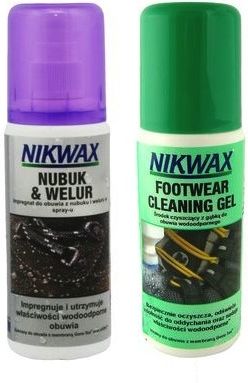 Zestaw dwóch preparatów do pielęgnacji wodoodpornego obuwia sportowego i turystycznego ( gładka skóra, zamsz, nubuk, tkaniny, w tym membranowe (Gore-Tex, SympaTex oraz eVent)) marki Nikwax – żel czyszczący i impregnat pozwoli Ci dłużej cieszyć się ulubioną parą butów. Dzięki nim usuniesz brud oraz zabezpieczysz obuwie przed przemakaniem. Pierwszy ze środków to żel czyszczący, dzięki któremu w bezpieczny sposób usuniesz zanieczyszczenia i odświeżysz właściwości oddychające. Drugi zaś to łatwy w aplikacji impregnat w sprayu, który w odświeża i utrzymuje właściwości wodoodporne i oddychające obuwia. Pojemność: 2 x 125 ml Sposób użycia:1. Opłucz obuwie czystą wodą, aby usunąć luźne zabrudzenia jak błoto i zwilżyć powierzchnię.2. Naciśnij aplikator gąbkowy opakowania żelu do zerwania plomby.3. Nanieś obficie na powierzchnię buta.4. W przypadku silnego zabrudzenia użyj szczotki, co umożliwi wniknięcie produktu w głąb obuwia.5. Spłucz obficie czystą wodą.6. W kolejnym kroku użyj impregnatu do ubuwia. Nanieś impregnat w sprayu równomiernie na zewnętrzną powierzchnię obuwia.7. Po 2-3 minutach usuń nadmiar impregnatu czystą ścierką. Pozwól obuwiu wyschnąć przed założeniem. Produkt należy stosować do pielęgnacji nowego i używanego obuwia celem utrzymania go w czystości. Użycie impregnatu może spowodować nieznaczną zmianę koloru obuwia. Należy wypróbować w najmniej widocznym miejscu, np. na języku obuwia. Nie dopuszczać do kontaktu z oczami. Przechowywać poza zasięgiem dzieci.